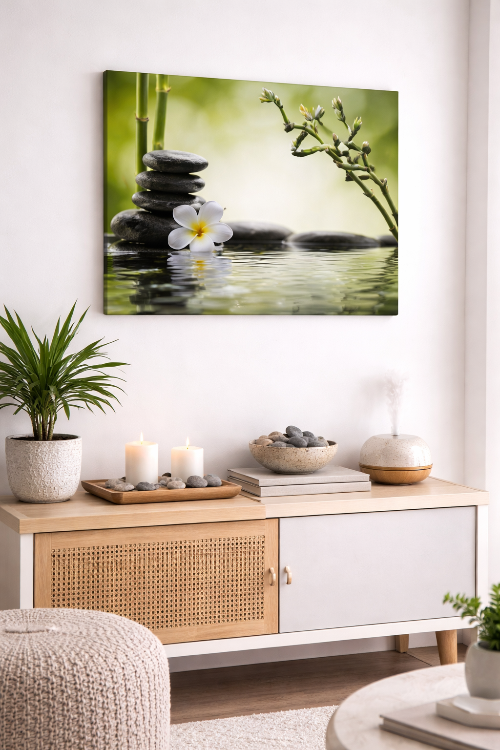 The soothing color palette and spa-inspired imagery make it the perfect addition to a bedroom, living room, bathroom, or meditation space. Printed on high-quality canvas and stretched over a sturdy frame, it offers a clean, gallery-style finish ready to elevate your walls.
