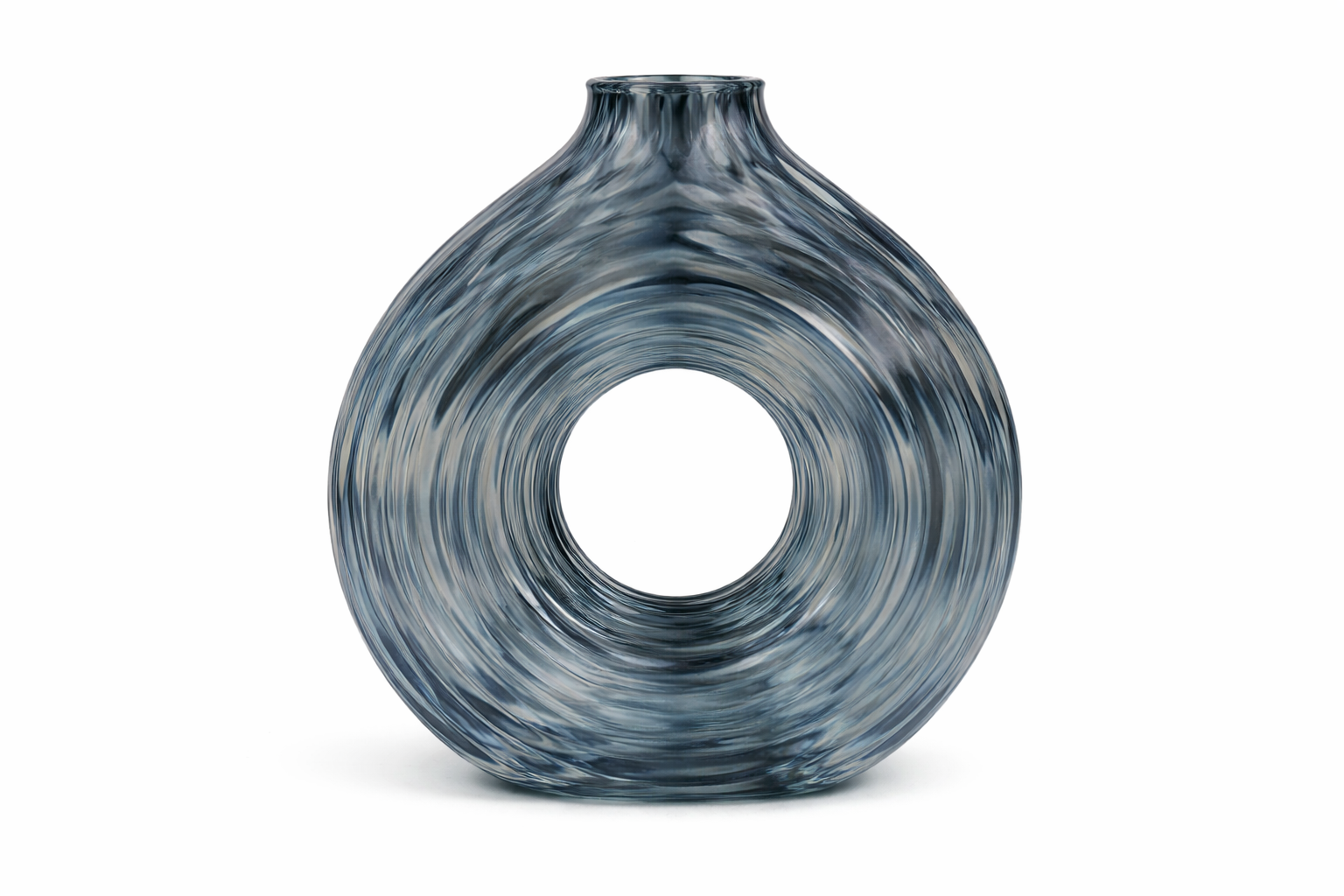 Modern and sculptural, this textured glass decorative vase features a striking central opening and flowing lines that beautifully catch the light.
