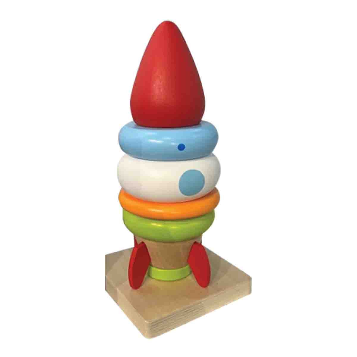 The Rocket Stacking Tower toy is a fun and educational wooden toy made of plywood and teawood. It features a rocket shape with different-sized pieces that can be stacked on top of each other to form a tower. This toy helps children develop their fine motor skills, hand-eye coordination, and spatial awareness while encouraging imaginative play