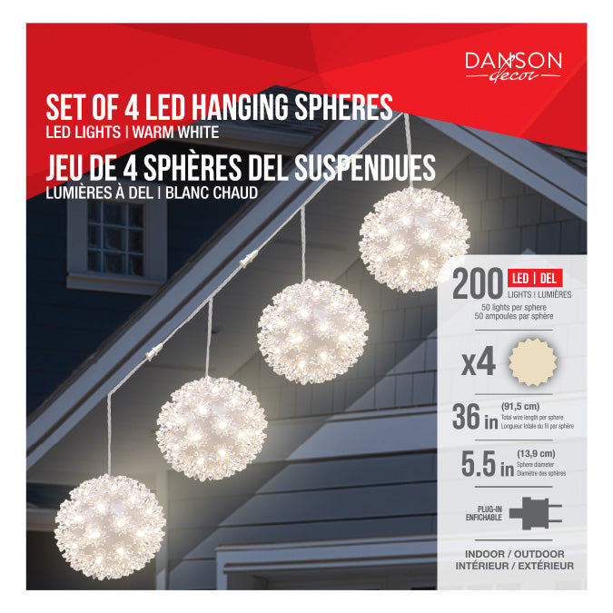 Set of 4 LED Hanging Spheres – Warm White (200 Count)