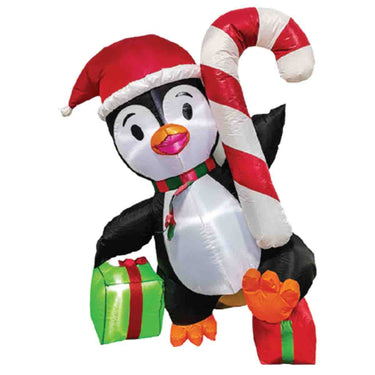 The Inflatable LED Light Up Penguin with Gifts & Candy Cane is a cheerful holiday decoration featuring a charming penguin holding gifts and a candy cane. Lit with LED lights, this inflatable penguin adds a festive glow to your indoor or outdoor Christmas display. Easy to set up and delightfully playful, it brings a touch of seasonal magic to your home.
