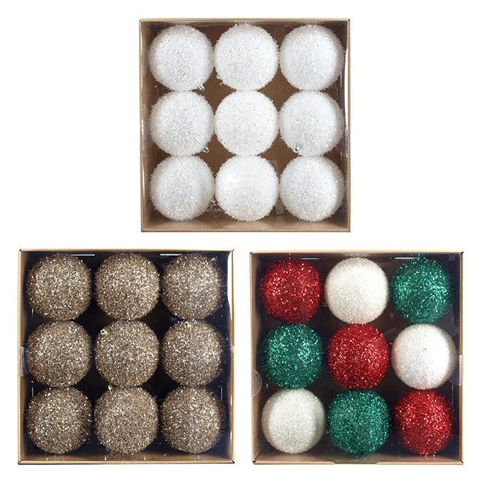 Pack of 9 Glittered Christmas Ball Ornaments – 11cm with Hooks (3 Assorted Styles) - Magasins Hart | Hart Stores Pack of 9 Glittered Christmas Ball Ornaments – 11cm with Hooks (3 Assorted Styles) - Magasins Hart | Hart Stores