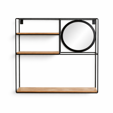 Elevate your wall décor with this modern metal shelf featuring integrated shelving and a circular mirror. Designed with a sleek metal frame and wood-look shelves, it offers the perfect balance of style and functionality. Ideal for displaying décor, plants, or everyday essentials, it adds depth and brightness to your space. Compact and versatile, this piece enhances any room with a refined, contemporary touch.