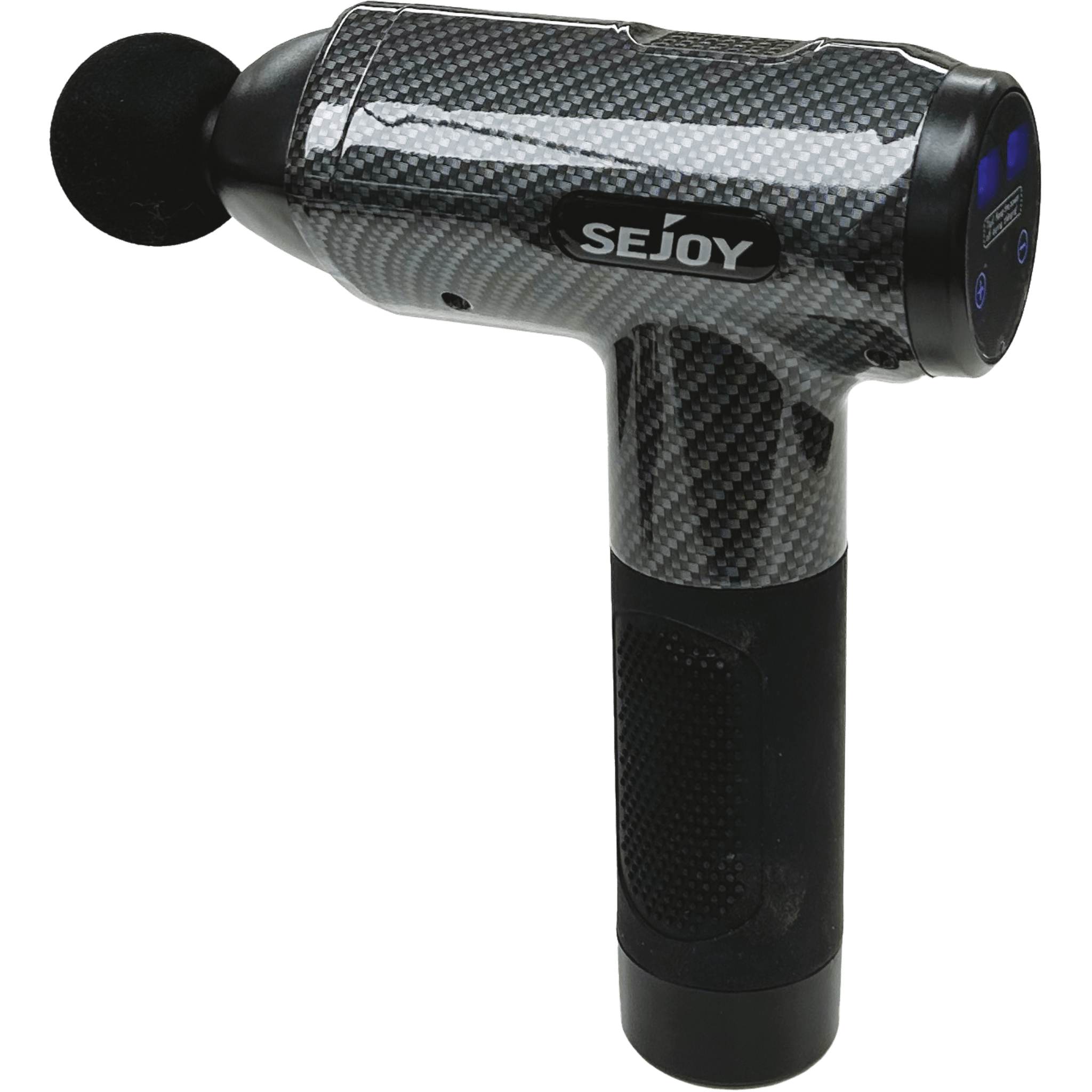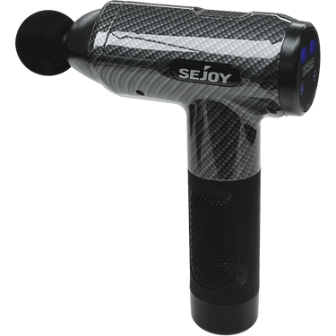 This compact SEJOY massage gun is a lightweight, portable percussion massager designed to relieve muscle tension, improve circulation, and speed up recovery. Its carbon-fiber patterned exterior gives it a sleek, modern look, while its ergonomic handle ensures a comfortable and secure grip during use.