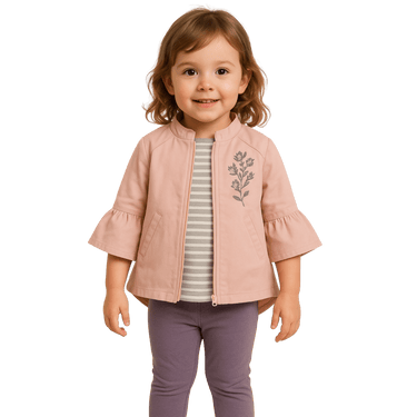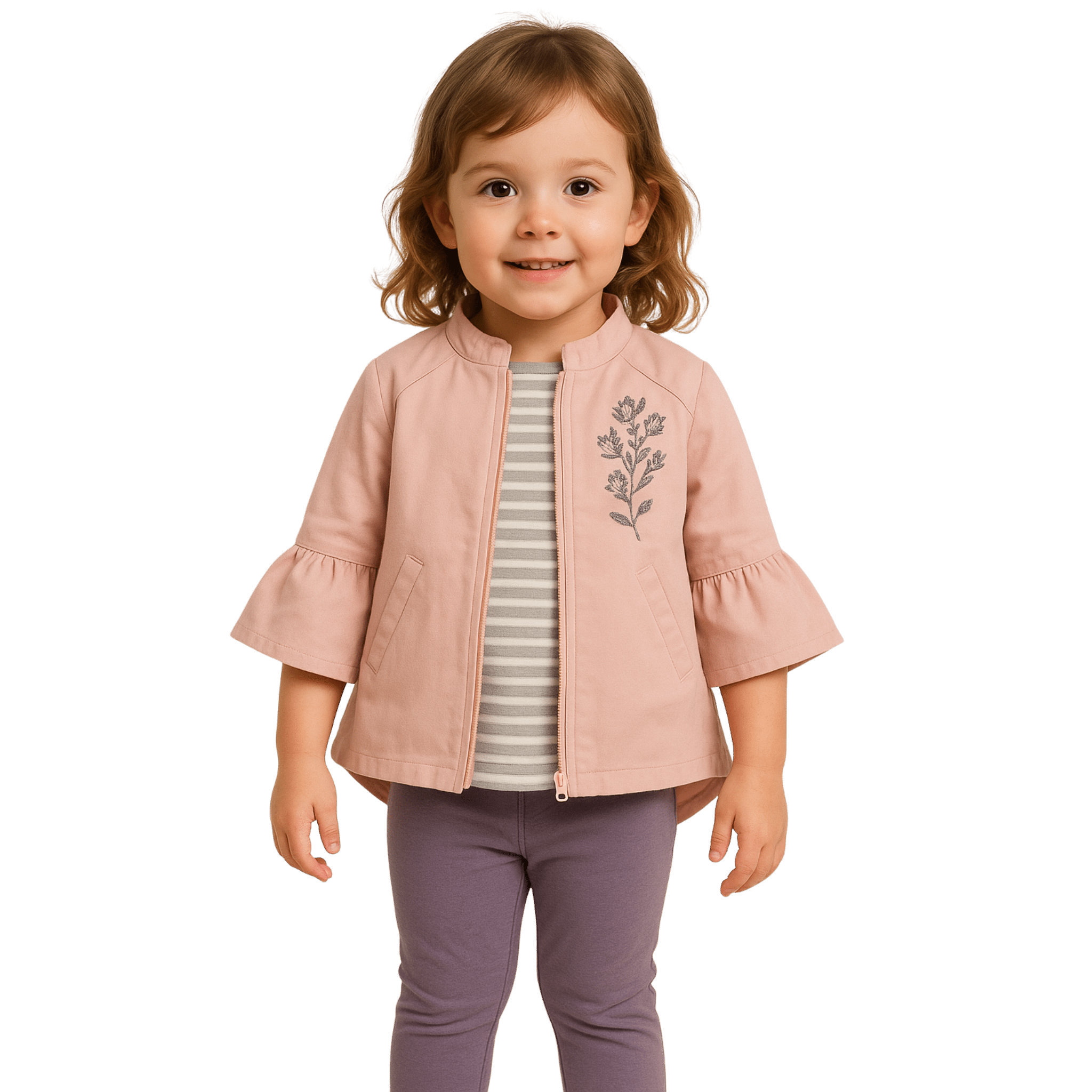 This adorable 3-piece set combines comfort and style for your little one’s everyday adventures. It features a soft pink jacket with delicate floral embroidery and flared sleeves, a classic grey-and-white striped cotton tee, and lilac stretch leggings for all-day comfort and freedom to move. Perfect for any occasion, this set delivers a polished yet playful look with ease.