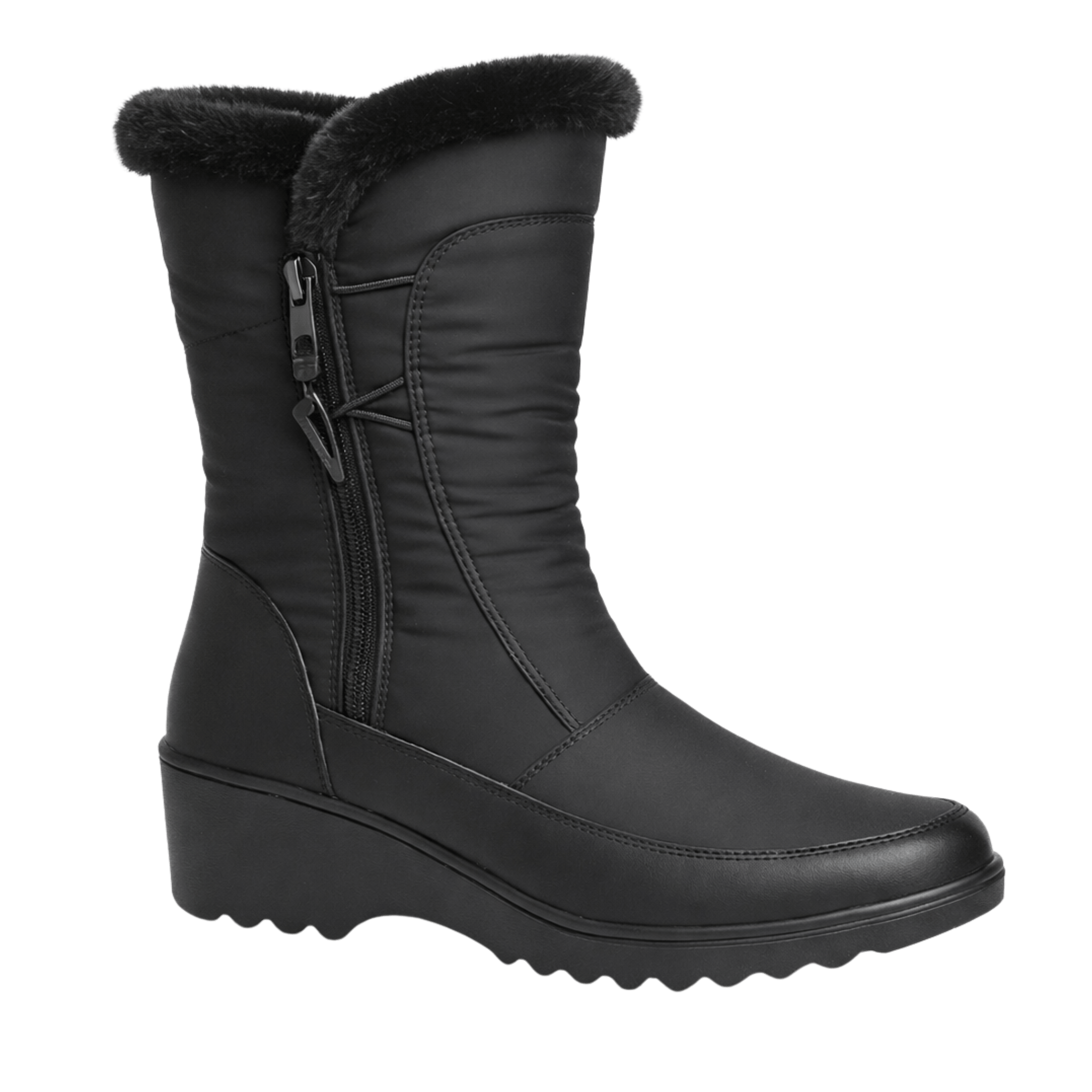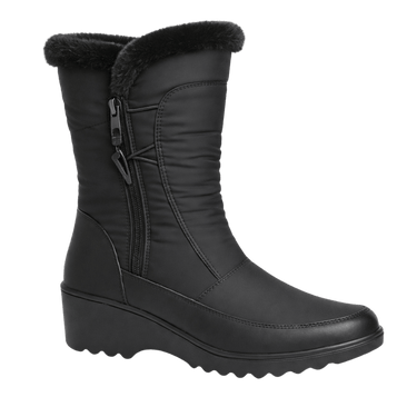 Stay warm and stylish all season long with this wedge winter boot. Designed for cold-weather comfort, it features a soft faux fur lining that keeps your feet cozy throughout the day. The side zipper allows for easy on and off, while the wedge sole provides added stability and support. A versatile essential that transitions effortlessly from city outings to everyday wear.