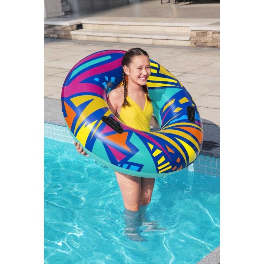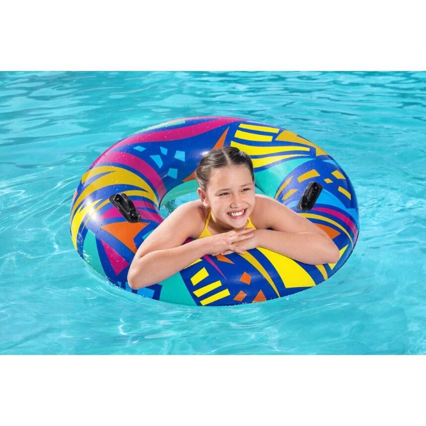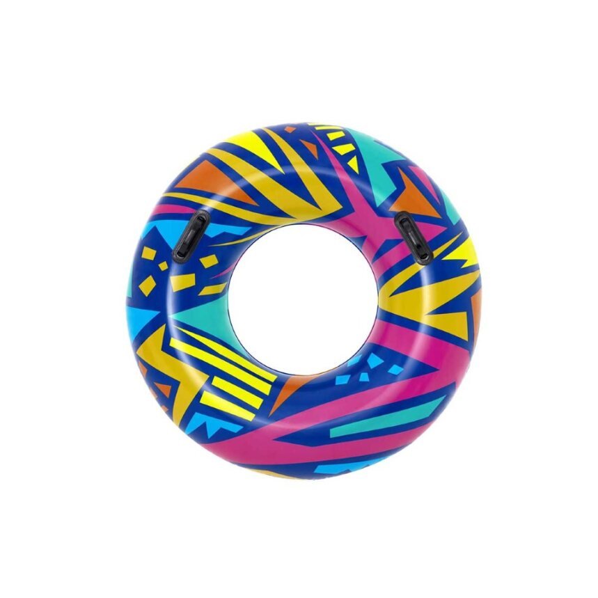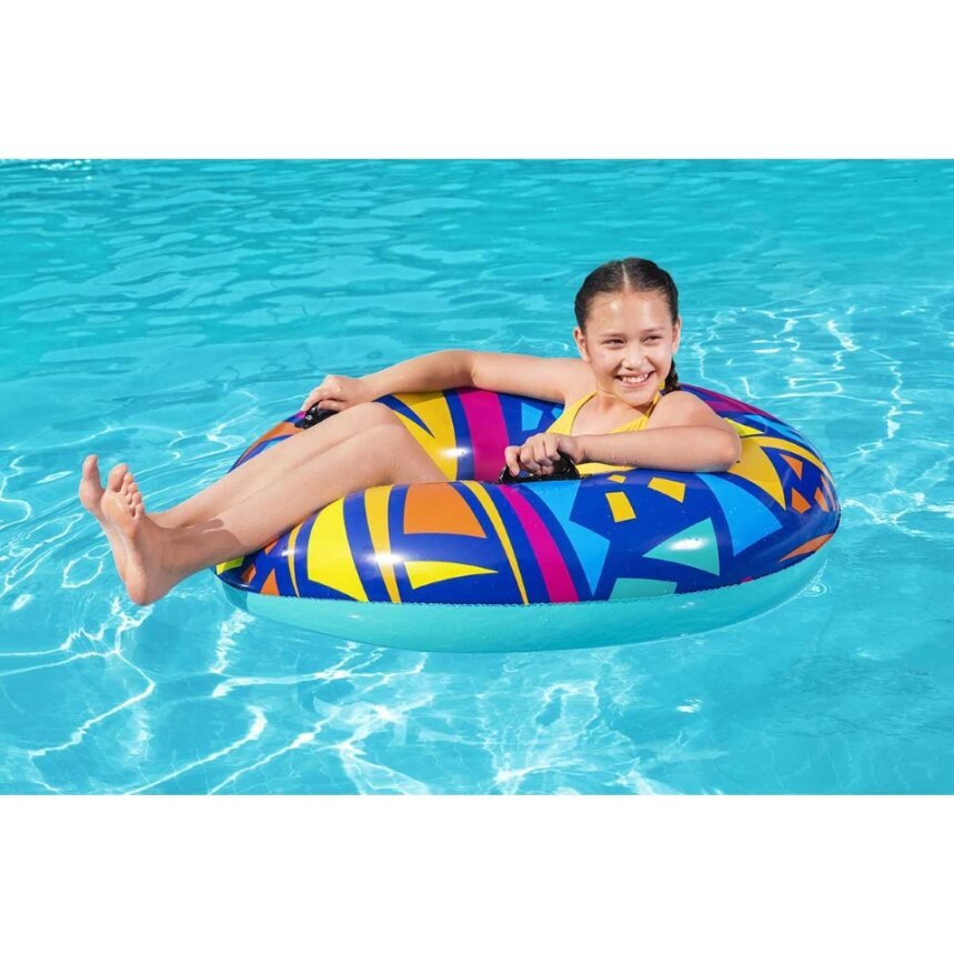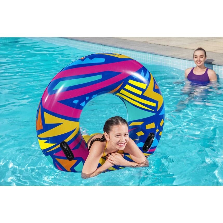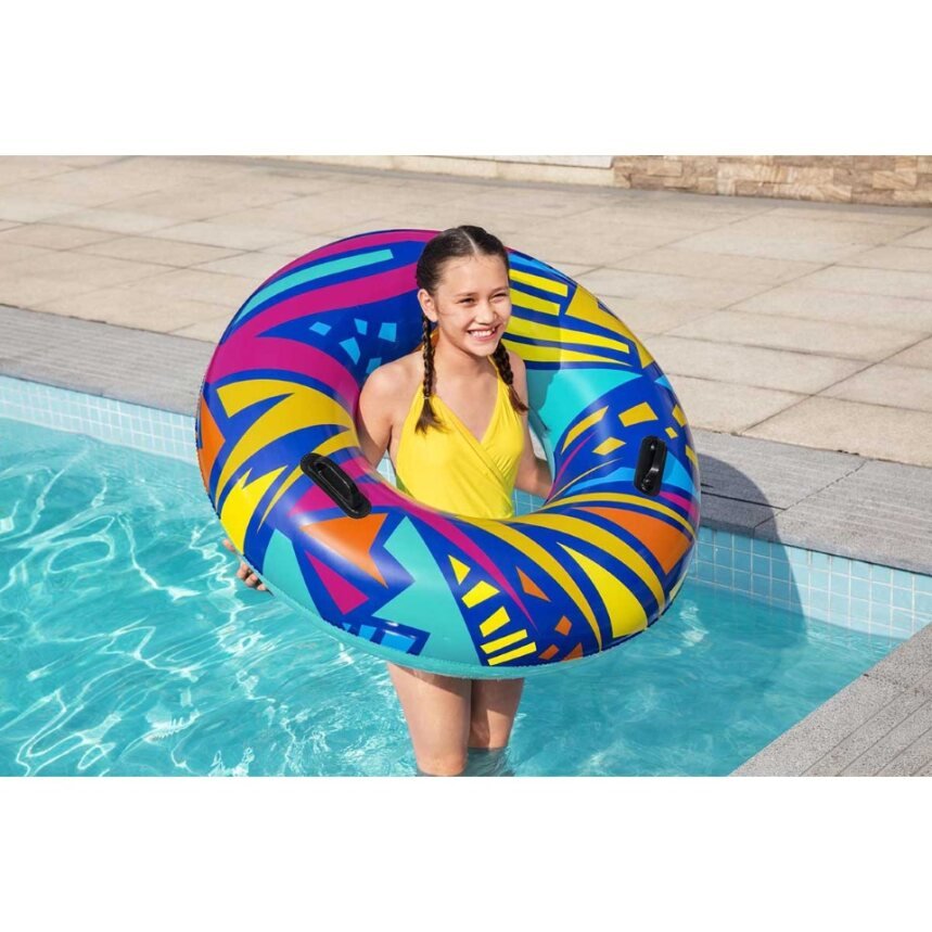 Make summer brighter from every angle with the Bestwayยฎ Geometric Swim Tube! Designed for swimmers ages 12 and up, this tube features creative, geometric graphics with a retro feel. This cool, zany design will grab the attention of everyone at the pool or beach. Perfect for parties, social media posts or just relaxing on the water, the Geometric Swim tube is versatile and fun. The built-in heavy-duty handles allow kids and adults to get a grip as they navigate through the waves. Simply inflate the ring and youโre ready to float on. Deflating the tube is quick and easy so you can easily store it for many warm days to come. Use it at birthday parties or sleepovers and bring a little trend and flare to your event. Kick back and relax in style with the Bestway Geometric Swim Tube.