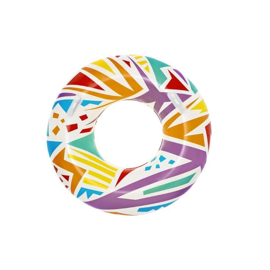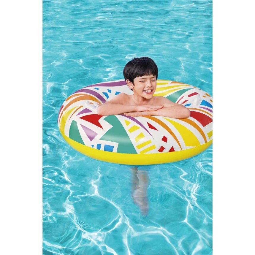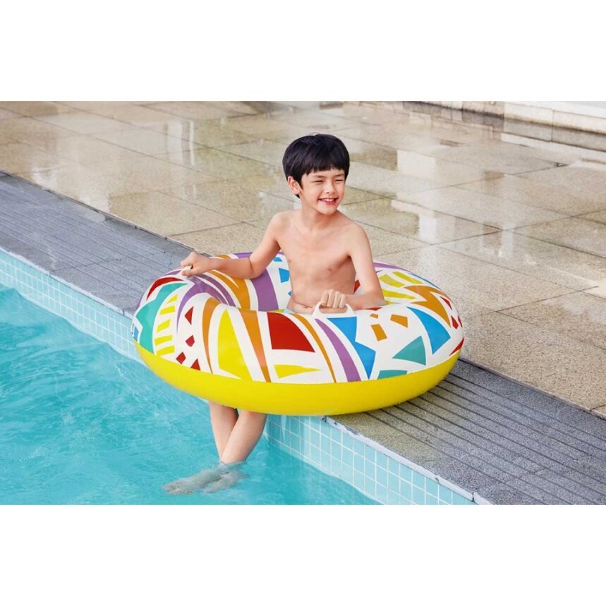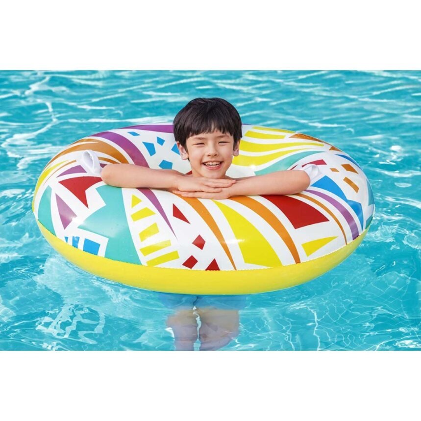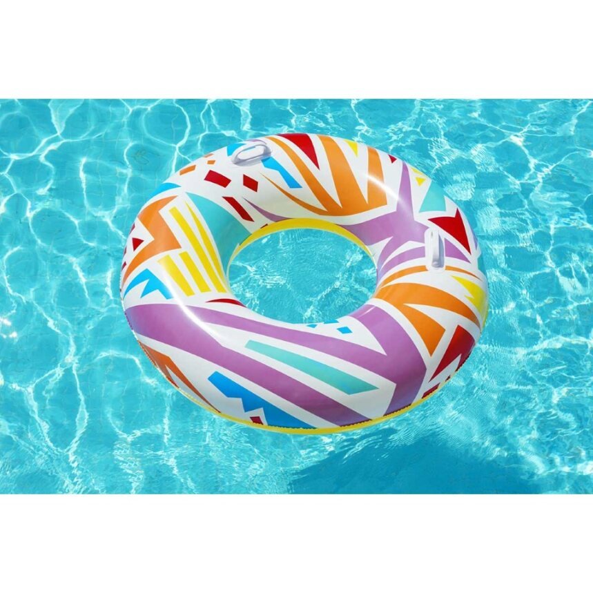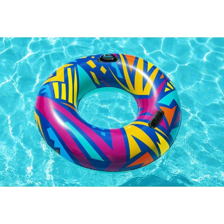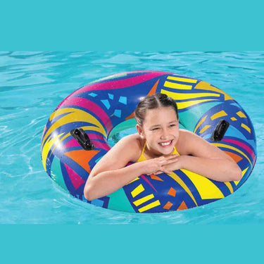 Make summer brighter from every angle with the Bestwayยฎ Geometric Swim Tube! Designed for swimmers ages 12 and up, this tube features creative, geometric graphics with a retro feel. This cool, zany design will grab the attention of everyone at the pool or beach. Perfect for parties, social media posts or just relaxing on the water, the Geometric Swim tube is versatile and fun. The built-in heavy-duty handles allow kids and adults to get a grip as they navigate through the waves. Simply inflate the ring and youโre ready to float on. Deflating the tube is quick and easy so you can easily store it for many warm days to come. Use it at birthday parties or sleepovers and bring a little trend and flare to your event. Kick back and relax in style with the Bestway Geometric Swim Tube.