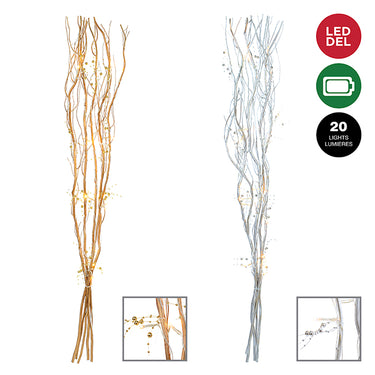 Add a warm, elegant glow to your seasonal décor with these painted twig branches. Each set includes assorted silver and gold finishes, featuring 20 warm white 5mm LED lights powered by batteries for easy placement anywhere in your home. Perfect for vases, arrangements, or as standalone accents, these decorative branches bring festive sparkle to your holiday displays.