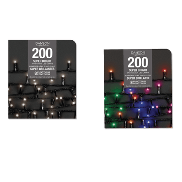 This light set includes 200 lights on a black wire, offers 8 functions with a lighted length