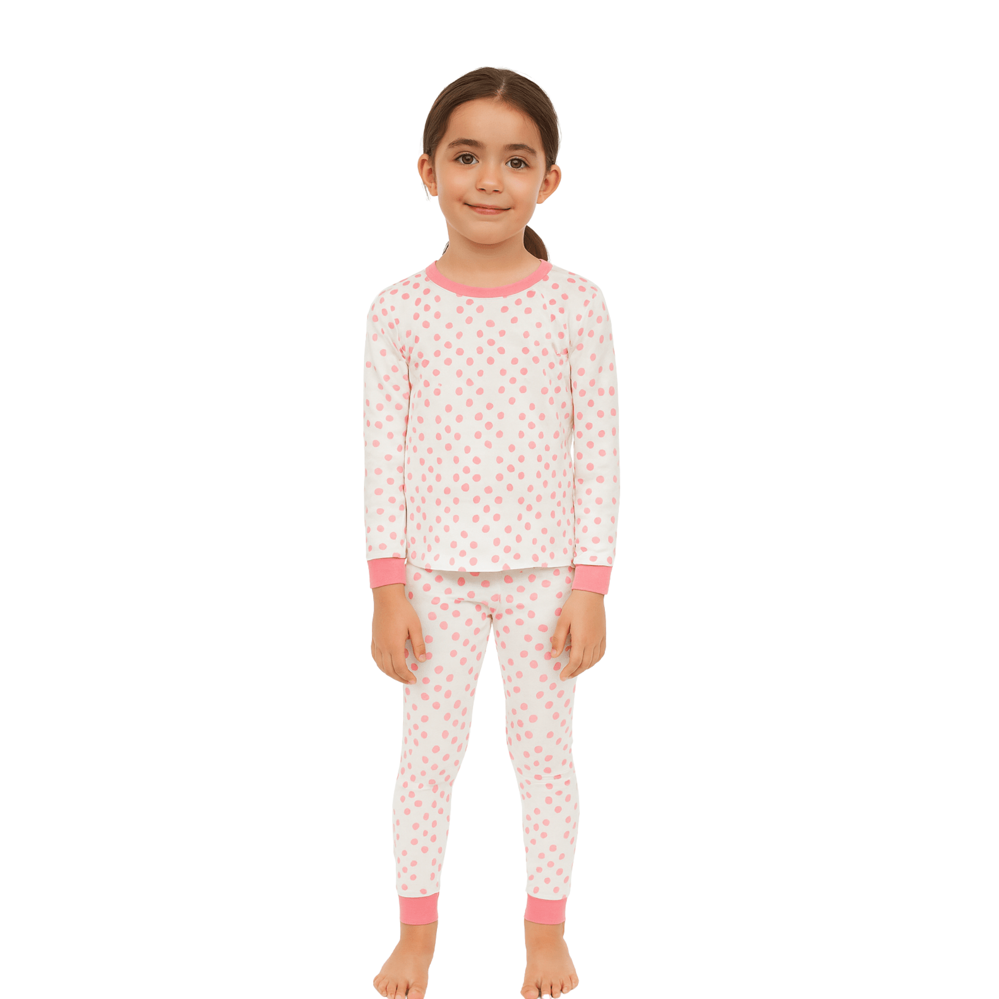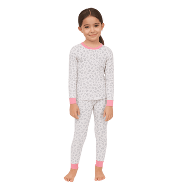 Soft, cozy, and perfect for bedtime cuddles — this 2-pack of printed pajamas will keep her comfy all night long. Each set features a long-sleeve top and matching pants made from soft, breathable cotton-blend fabric. Designed with fun prints — one with playful pink polka dots and the other with a subtle grey leopard pattern — both styles are finished with pink ribbed cuffs for a charming touch. Snug-fitting and stretchy, these pajamas are ideal for restful nights or relaxed mornings at home.