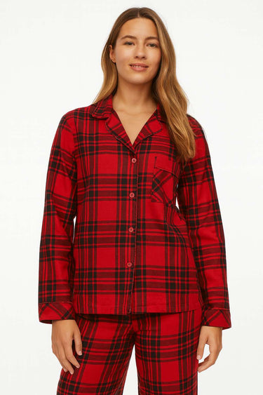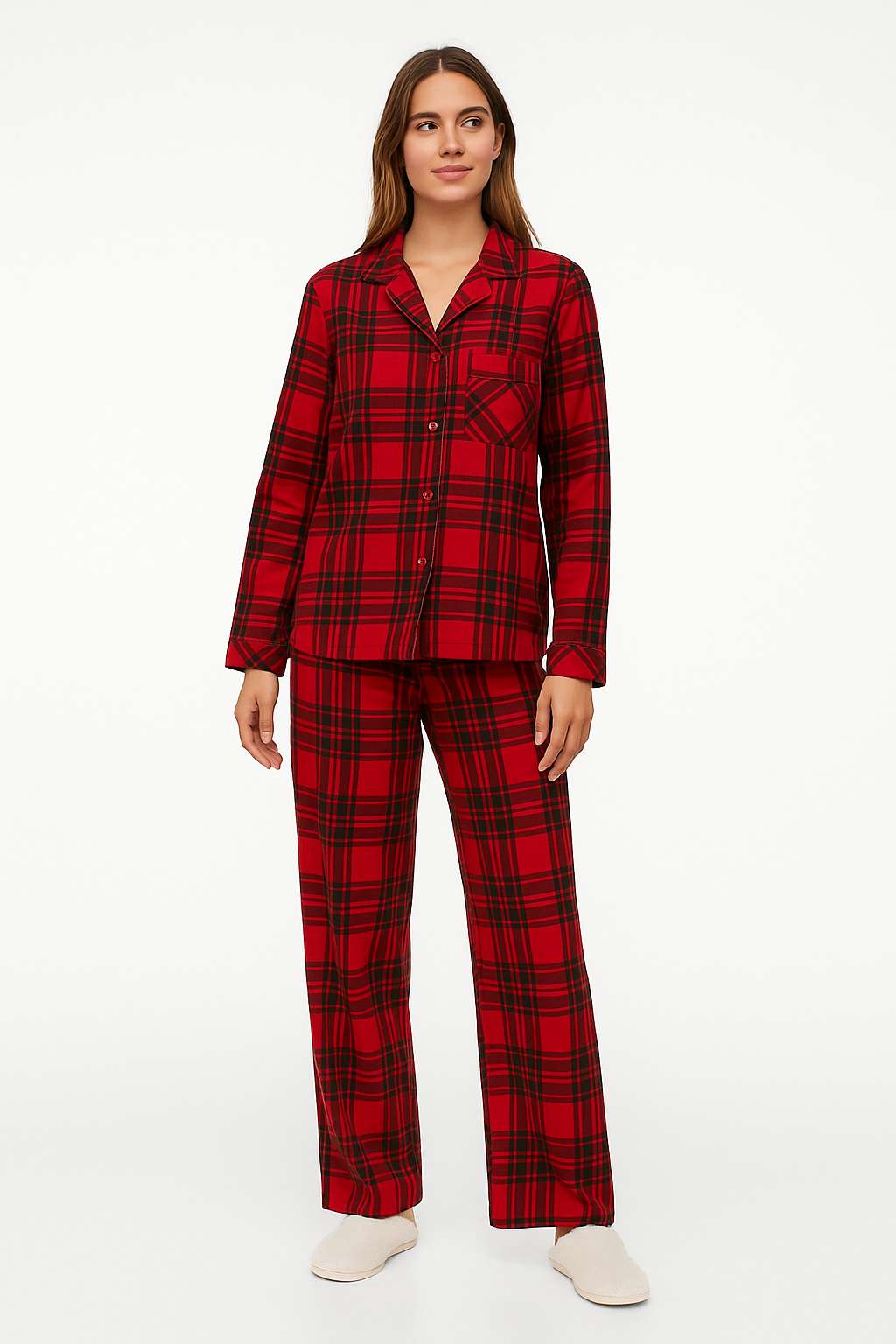 Classic and cozy, this red checked pyjama set is made for comfort and timeless style. The button-up shirt with a notched collar and chest pocket pairs perfectly with straight-leg pants for easy wear. Soft and breathable, it’s the ideal set for restful nights or relaxed mornings at home.
