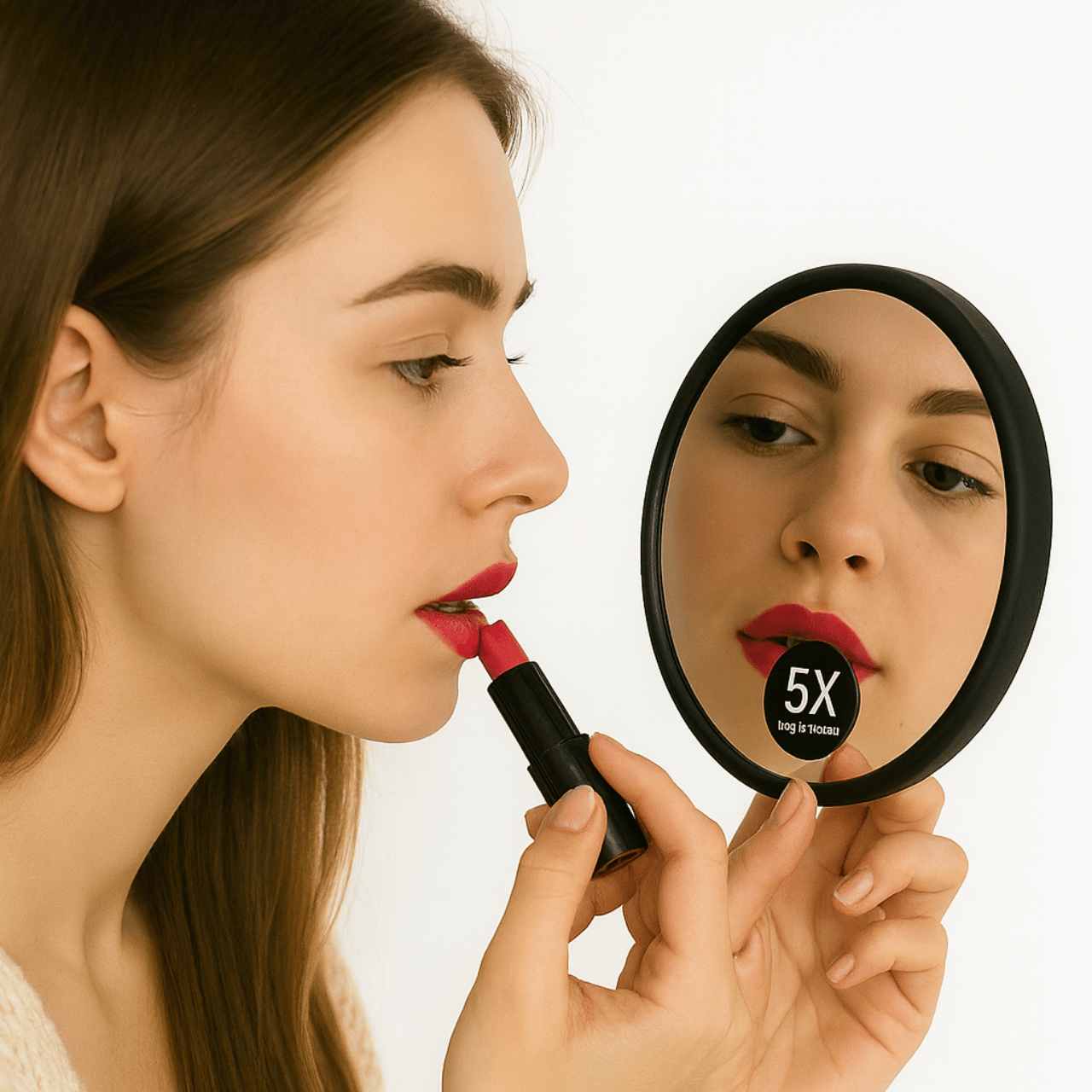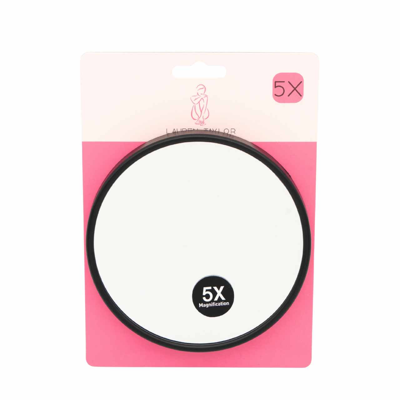 An essential beauty accessory, this 5X magnifying mirror allows for precise makeup application. Perfect for lipstick, brows, or detailed touch-ups, it provides a clear and accurate reflection for flawless results. Its practical size and clean black design make it a must-have for your beauty routine, whether at home or on the go.