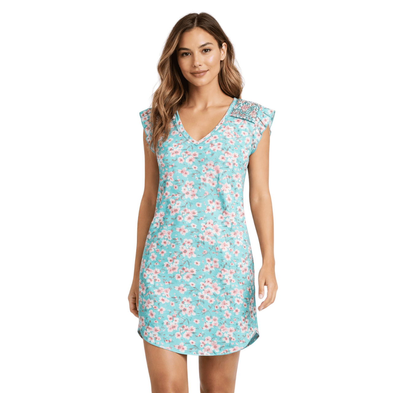 Soft and feminine, this printed nightdress is designed for ultimate comfort and effortless style. Its fluid silhouette allows easy movement, while the V-neckline and delicate ruffle sleeves add a graceful, elegant touch.