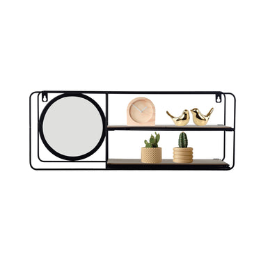 Its sleek black metal frame surrounds MDF shelves, while the integrated round mirror adds depth and light to your space.