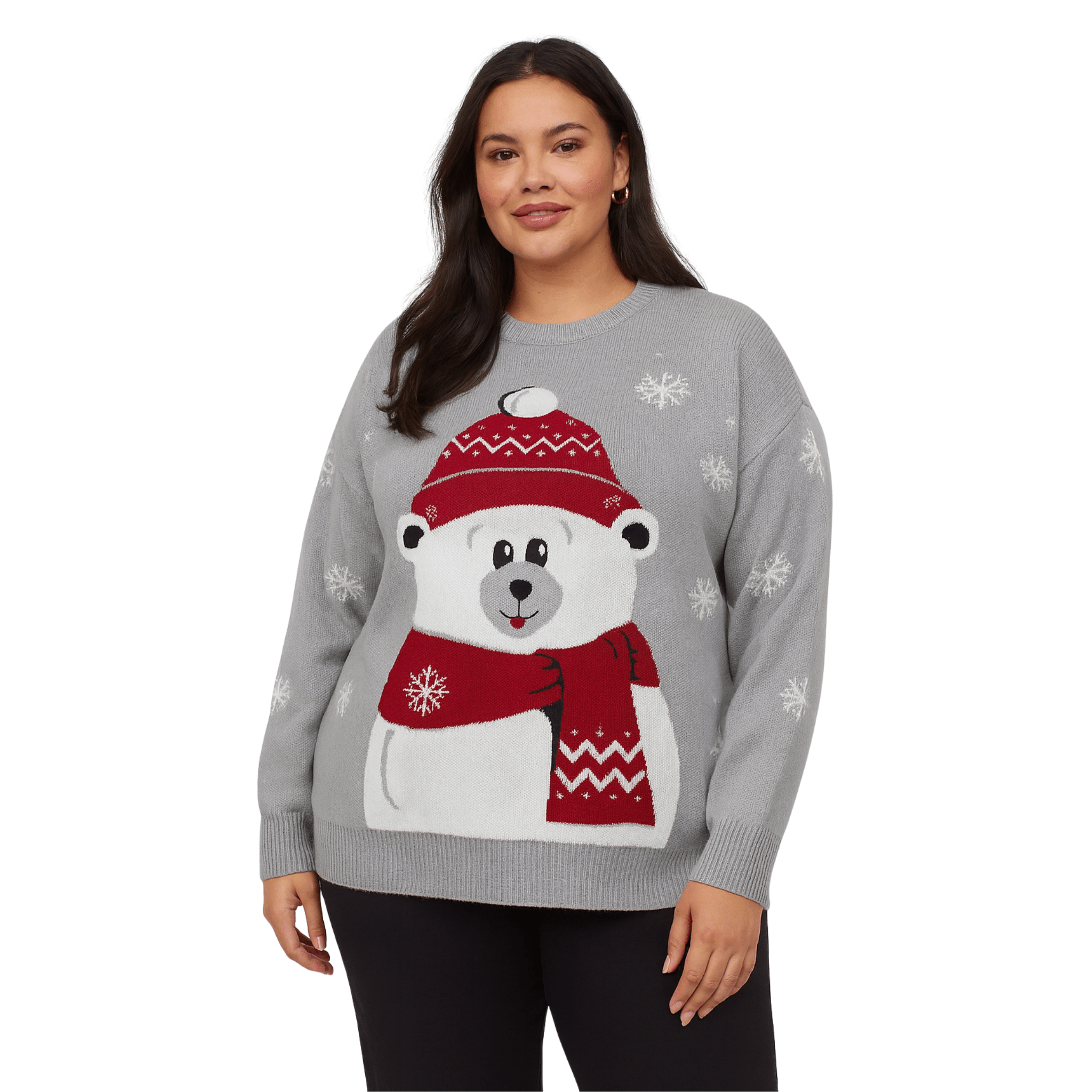 Add a touch of fun and warmth to your winter wardrobe with our plus size festive holiday sweaters. Designed for comfort and joy, these cozy knits feature playful holiday motifs — from cheerful reindeer and cuddly polar bears to a whimsical Santa-in-a-wine-glass design. Each piece offers a soft, stretchy feel and a flattering relaxed fit that makes celebrating the season even more enjoyable.