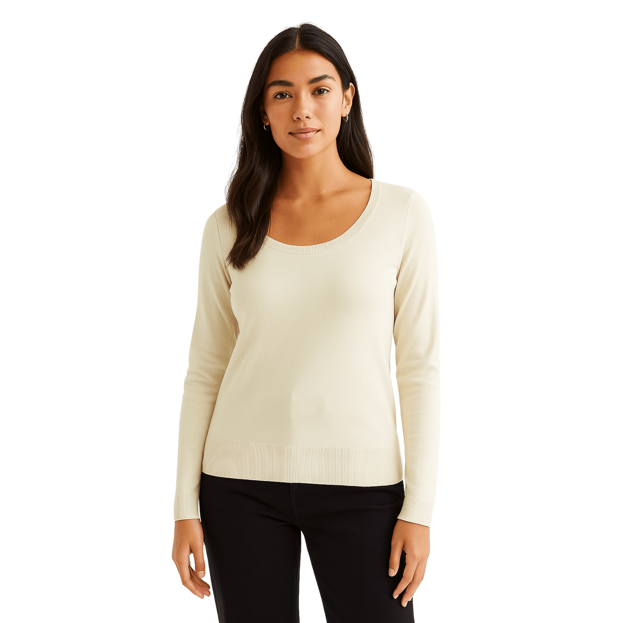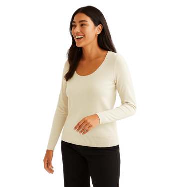 Elevate your everyday style with this soft knit scoop neck sweater. Designed with a timeless silhouette, it offers a perfect balance of comfort and elegance. The lightweight fabric drapes beautifully, making it an ideal choice for layering or wearing on its own. Its fitted shape and ribbed details at the cuffs and hem add a touch of sophistication to a classic piece.