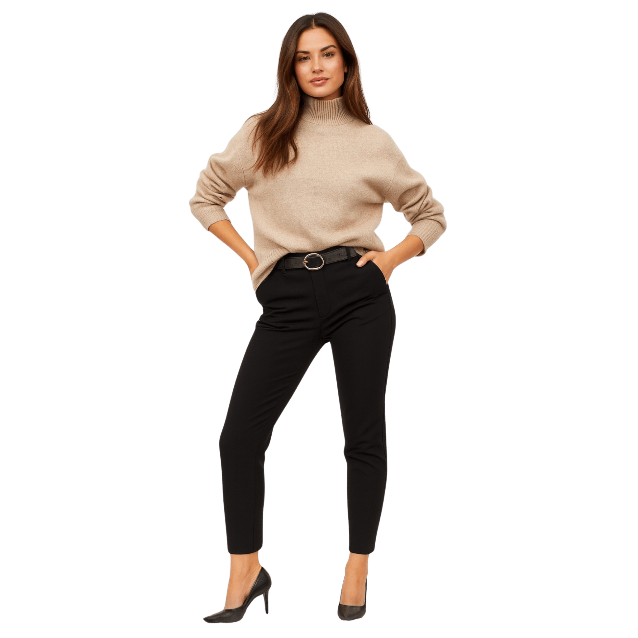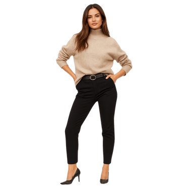 Élégant et indispensable, ce pantalon ajusté allie structure, confort et modernité. Conçu dans un tissu extensible doux, il offre une silhouette épurée qui flatte naturellement. La ceinture incluse, dotée d’une boucle métallique chic, apporte une touche sophistiquée, idéale autant pour le bureau que pour vos tenues du quotidien.