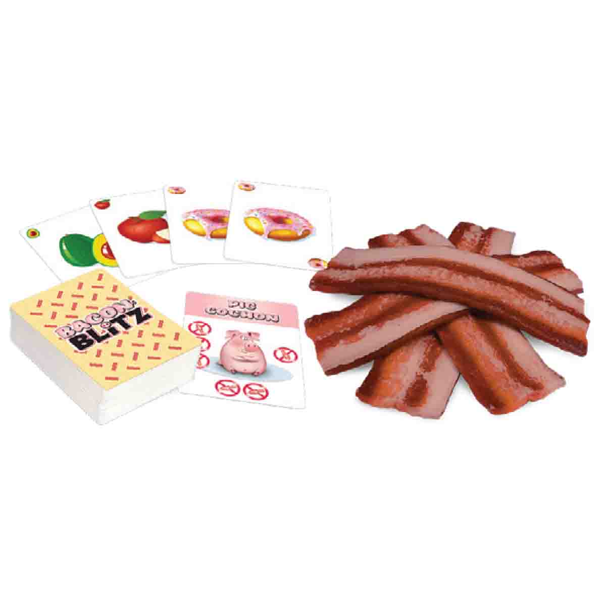 Bacon Blitz est un jeu de cartes amusant et unique, parfait pour 3 à 5 joueurs âgés de 6 ans et plus. Avec son concept sur le thème du bacon, il est sûr de fournir un divertissement agréable et engageant pour les enfants comme pour les adultes.