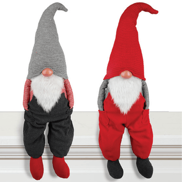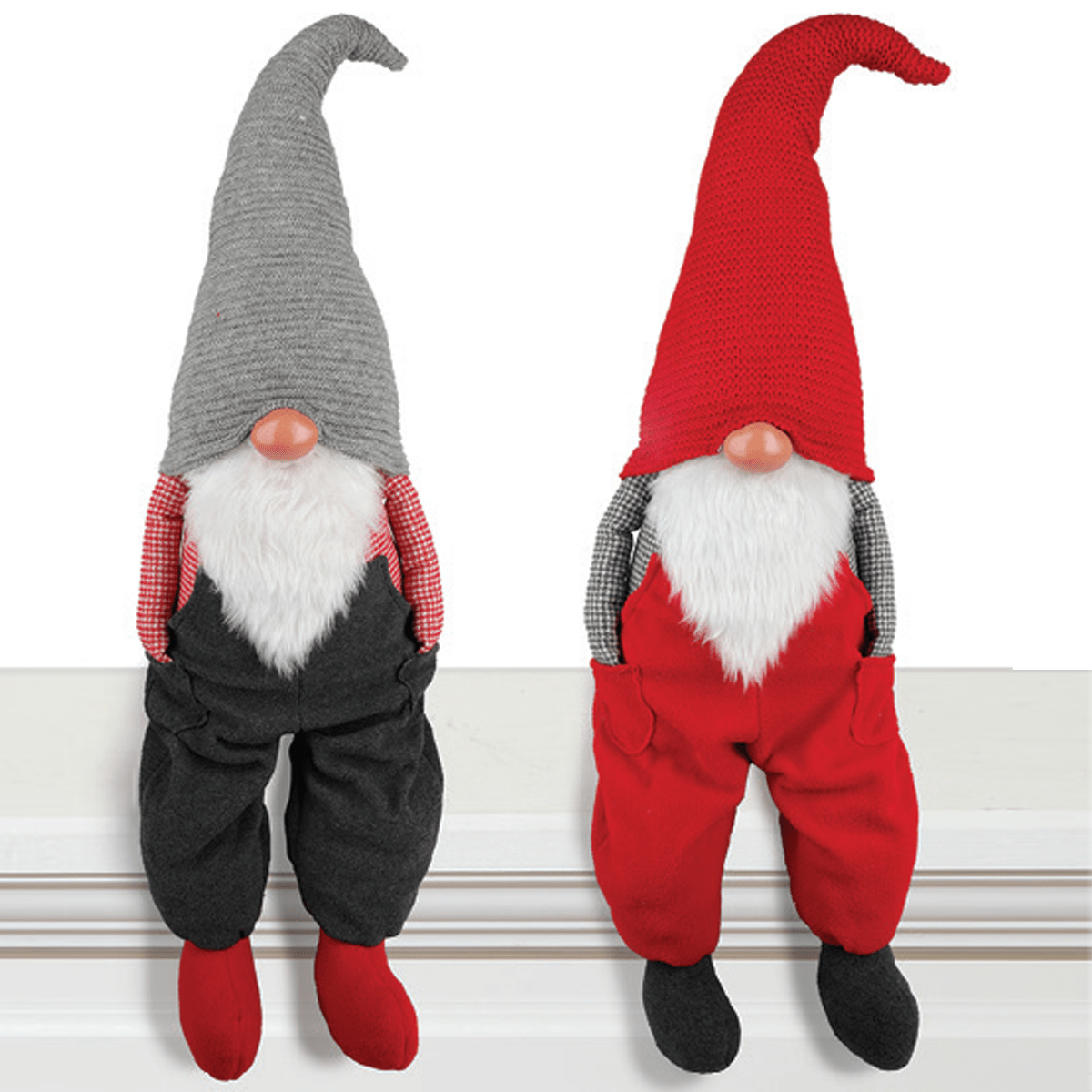 GNOME PÈRE NOËL ASSIS EN TISSU AVEC SALOPETTE ET BONNET TRICOTÉ – 110CM, 2 MODÈLES ASSORTIS : ROUGE/GRIS