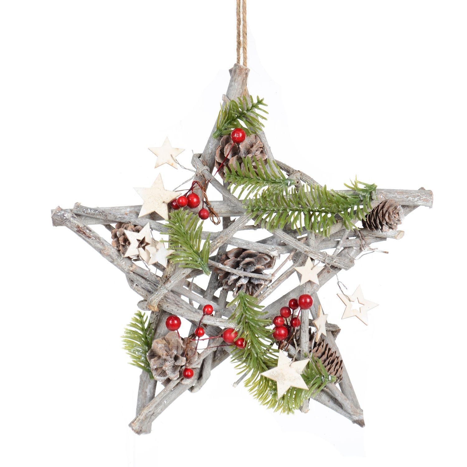 Apportez un charme rustique et festif à votre intérieur avec cette étoile suspendue en bois de 30 cm. Fabriquée à la main en bois naturel, elle est magnifiquement ornée de branches de pin, de baies rouges, de pommes de pin et d'étoiles blanches décoratives. Accessoire saisonnier idéal, cette étoile apporte chaleur et élégance naturelle à vos portes, fenêtres et décorations murales.