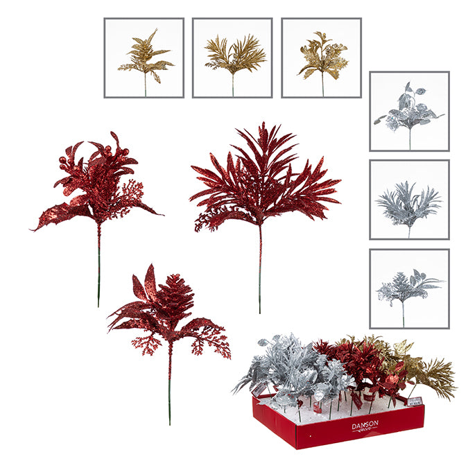 Ajoutez une touche d'éclat et de charme festif à votre décoration de Noël avec ces pics pailletés de 13 cm ornés de baies et de pommes de pin. Disponibles en finitions assorties rouge, or et argent , ils sont parfaits pour embellir sapins de Noël, couronnes, guirlandes, compositions florales ou centres de table. Chaque pic apporte brillance et texture, pour créer facilement un look glamour pour les fêtes. Présentés dans un présentoir pratique , ils sont prêts à être choisis et décorés.