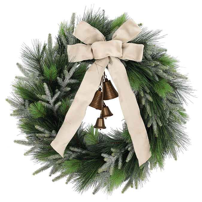 Couronne de pin mélangé de 76 cm avec ruban en tissu et clochettes