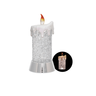 With a white snow globe effect, the glitter inside this beautiful candle swirls and sparkles while lights shine and the "flame" at the top flickers just like a real candle