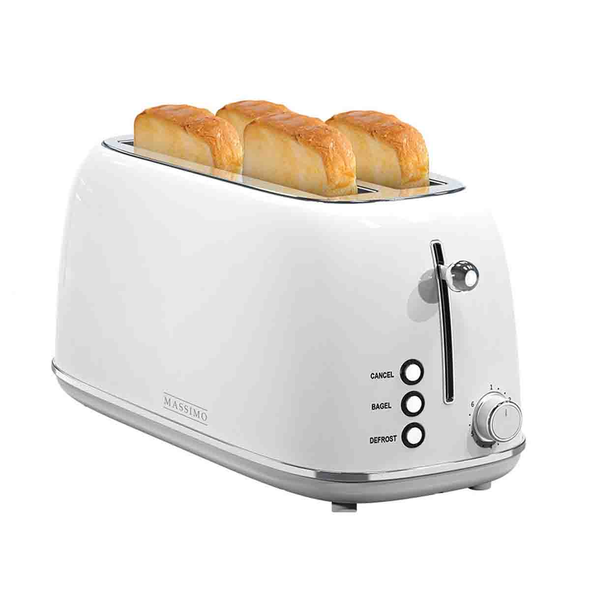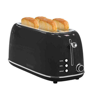 Le grille-pain Massimo Vintage à 4 tranches offre un délicieux mélange de charme et de commodité moderne. Son design vintage, avec ses accents chromés classiques, ajoute une touche d'élégance intemporelle au plan de travail de votre cuisine. Les larges fentes permettent d'accueillir différents types de pain, ce qui en fait un complément polyvalent et élégant à votre plan de travail.