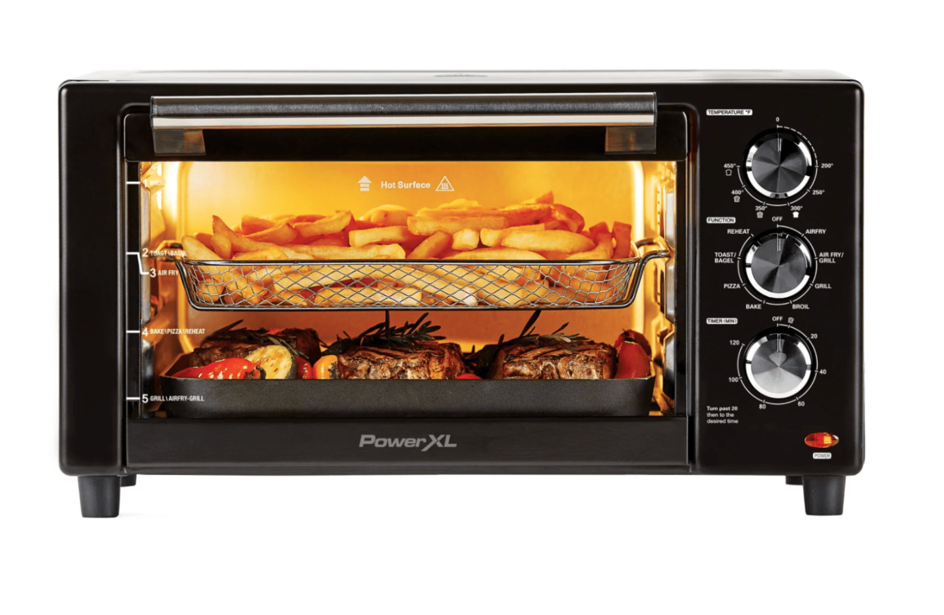PowerXL Air Fryer Grill de la marque de friteuses la plus vendue aux Etats-Unis*. Gril d'intérieur multi-cuisson et friteuse à air avec une capacité familiale pour 6 énormes hamburgers ou un poulet de 10 livres. Comprend une poêle à griller antiadhésive, un panier à friture en filet en acier inoxydable, une plaque de cuisson, une grille de rôtissage en acier inoxydable, un plateau d'égouttage et un livre de recettes. Rôtissoire vendue séparément.