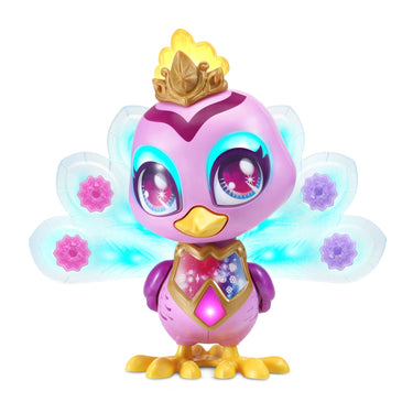 Playtime is magical with Sparklings Penny the Peacock! This beautiful peacock toy talks, sings and lights up with a kaleidoscope of colors. Touch Penny’s magical necklace, the touch her crest, eyes and tail to change their color. Penny will respond with more than 100 fun, magical responses about her mood, feelings and lucky colors. Sing a colorful duet with Penny by touching her mouth. Push Penny’s wing to move her tail and trigger lights and playful responses. Add some extra flair with four charms to put on her tail or place the crown on her head. Collect all the Sparklings (each sold separately) for more colorful play! Intended for ages 4+ years. Requires 2 AAA batteries. Batteries included for demo purposes only. New batteries recommended for regular use.