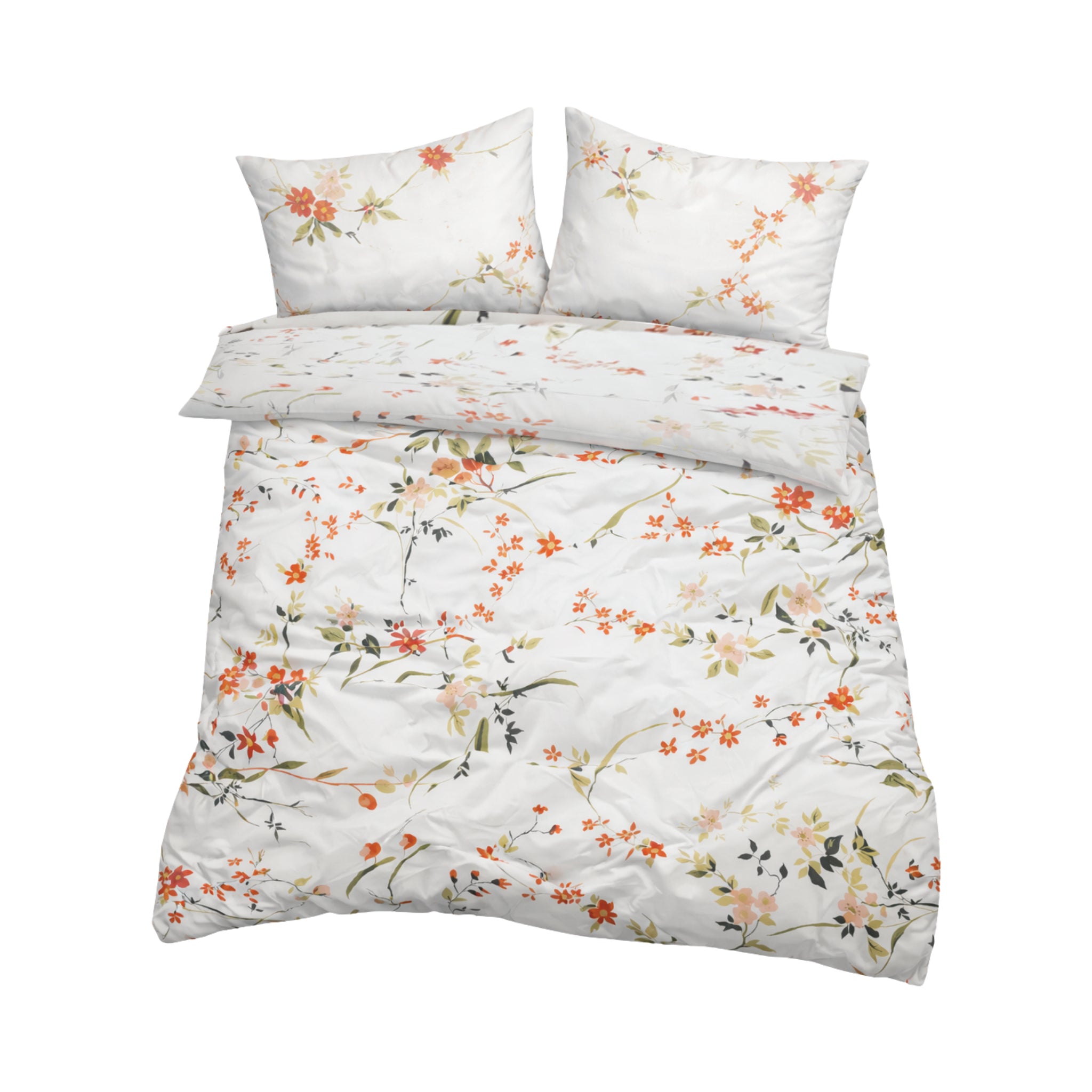 Featuring a delicate floral pattern in shades of coral, orange-red, and soft yellow with lush green leaves, this set creates a fresh and inviting atmosphere.