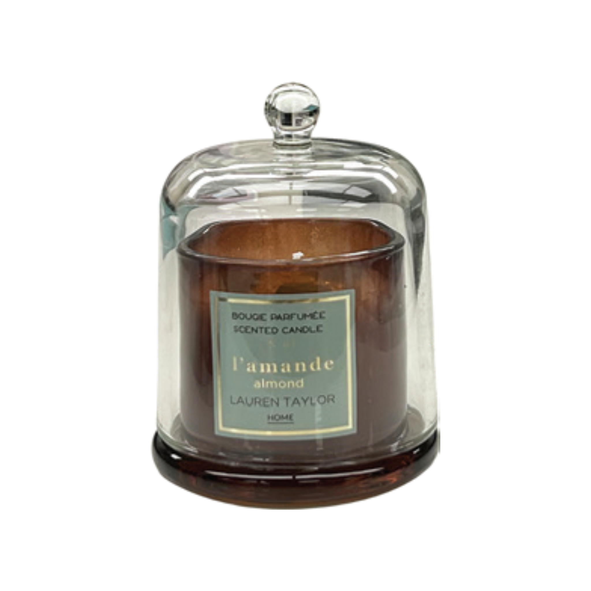 Create a warm and inviting atmosphere with this almond scented candle, beautifully displayed under a clear glass cloche.