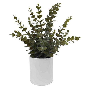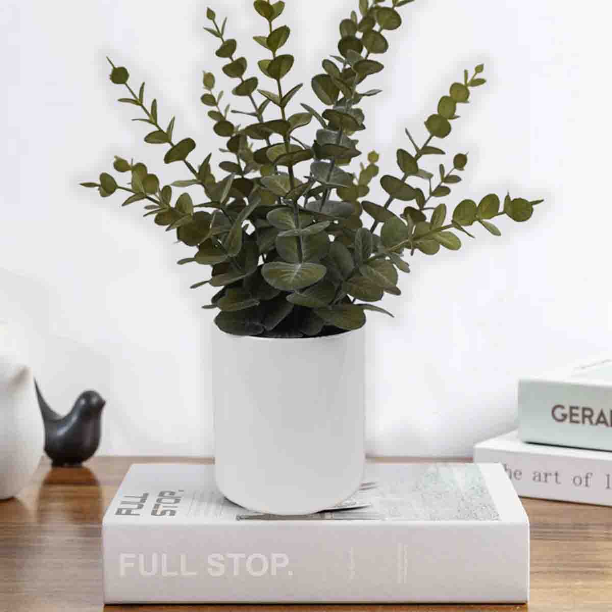 The Artificial Eucalyptus Plant in a white ceramic pot is a charming and low-maintenance decorative accent that brings a touch of greenery to your space.The lifelike faux eucalyptus plant is beautifully displayed in a sleek white ceramic pot, adding a fresh and botanical element to your decor. Ideal for enhancing the aesthetic of shelves, desks, or any area needing a touch of nature, the Artificial Eucalyptus Plant in a white ceramic pot is a versatile and appealing decor piece that effortlessly brightens up your home or office.