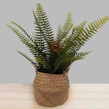 An artificial fern in a wicker basket is a classic and timeless decor piece that brings a touch of nature indoors. This realistic-looking artificial plant requires no maintenance and adds a pop of greenery to any room. The wicker basket adds a rustic and earthy element to the overall aesthetic, making it a lovely addition to any living space or office environment.