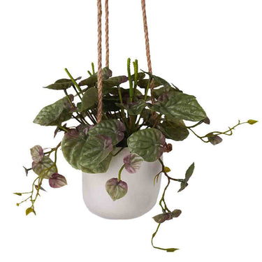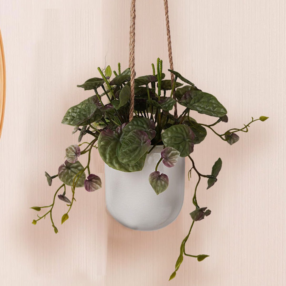 The artificial hanging plant with a white ceramic pot is a charming and low-maintenance decorative accent. The elegant white ceramic pot complements the lush greenery, making it a versatile and aesthetically pleasing addition to home or office decor.