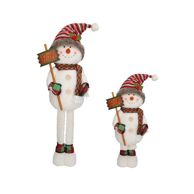 Make a bold and joyful statement this holiday season with this extra-tall Fabric Standing Snowman! Measuring up to 1.37 meters with extendable legs, this charming snowman brings festive cheer and personality to any space. Dressed in classic white, red, and green with a cozy hat and scarf, he’s the perfect blend of traditional Christmas spirit and playful design.
