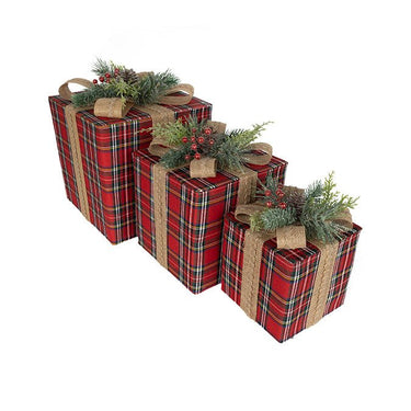 Add a festive touch to your holiday décor with this charming set of 3 decorative gift boxes. Covered in classic red plaid fabric, each box is topped with a natural ribbon and seasonal greenery for a rustic yet elegant look. The three graduated sizes (19cm, 24cm, 29cm) make them perfect for displaying together under the tree, on mantels, or as part of a festive centerpiece.