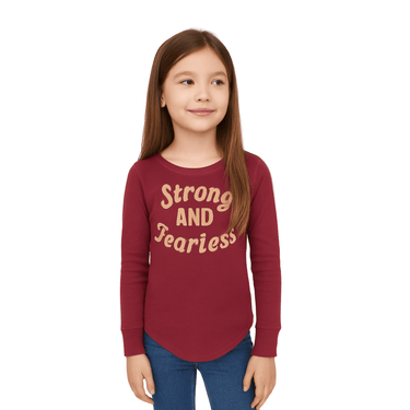 Empower her everyday style with this “Strong and Fearless” long-sleeve top. Crafted from soft, ribbed cotton-blend fabric, it offers both comfort and confidence in one stylish piece. The rounded hem and fitted sleeves bring a modern touch, while the bold slogan adds a fun, inspiring vibe. Perfect for school days, playtime, or weekend outings, this top easily pairs with jeans, leggings, or skirts for a cool and effortless look.