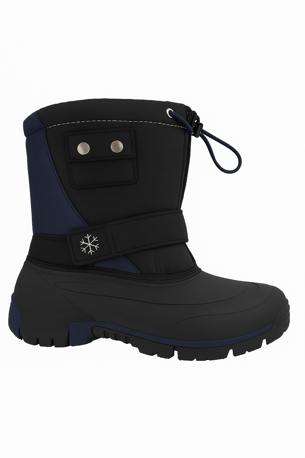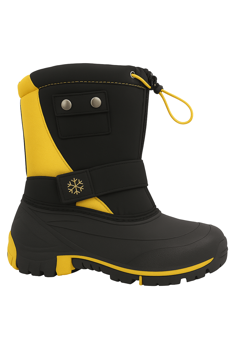 Conquer cold and snowy days with these insulated winter boots, built for both warmth and durability. Featuring an adjustable strap with a snowflake detail and a drawstring closure at the top, they ensure a secure and comfortable fit while keeping snow out. The water-resistant shell and thick rubber sole offer excellent protection and traction on slippery surfaces. Available in bold color contrasts like navy blue or yellow, these boots combine practicality with a touch of style for winter adventures.