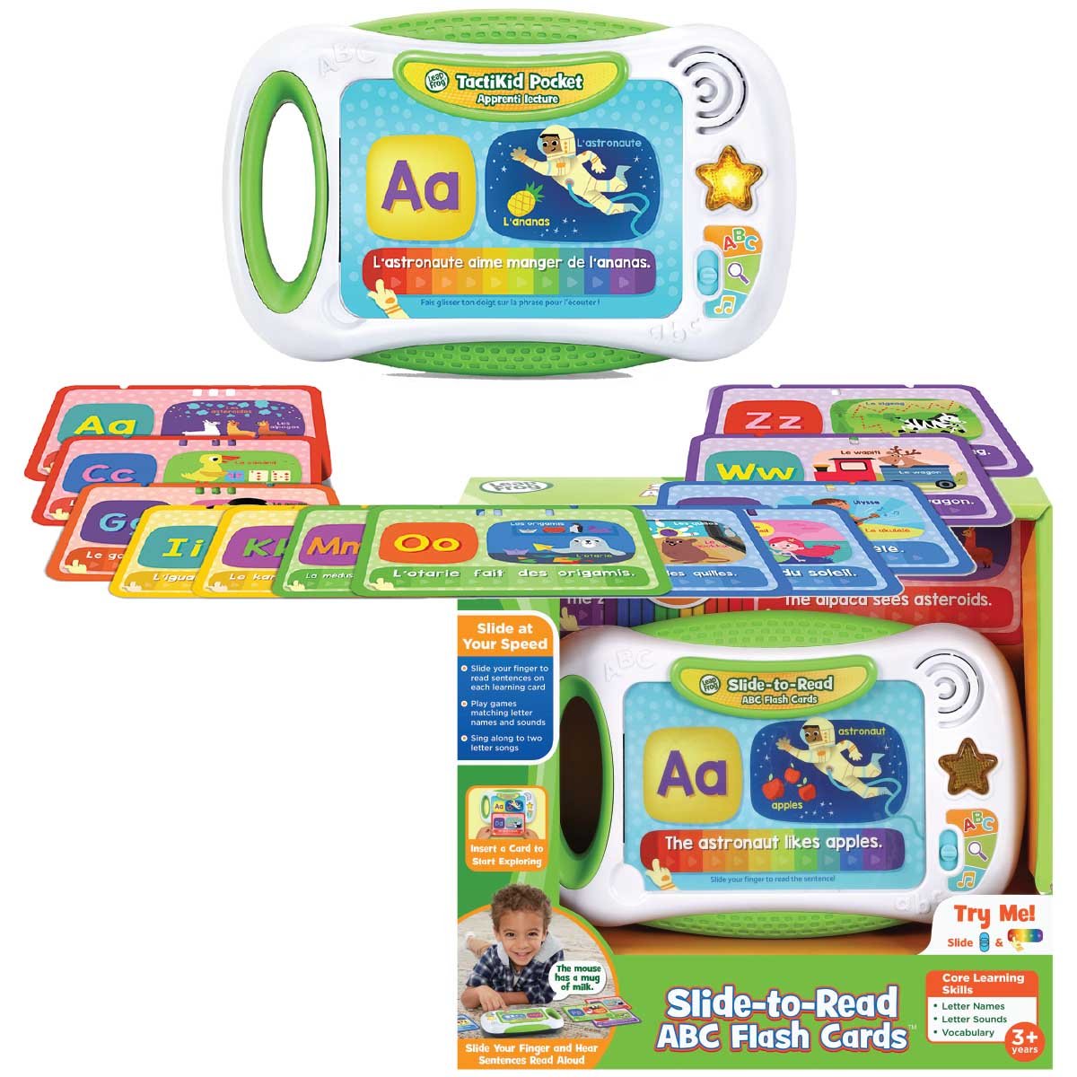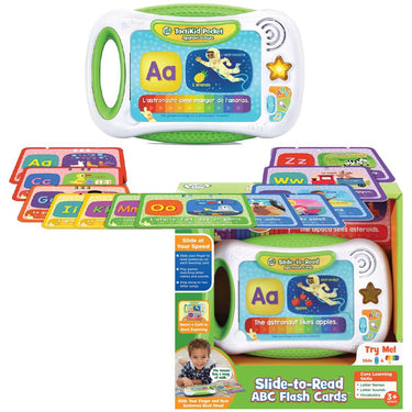 Slide into reading with the Slide-to-Read ABC Flash Cardsβ’. From A-Z, the 13 double-sided cards feature letters, words, sentences and colorful pictures. Learning our ABCs is as easy as counting 1, 2, 3. Preschoolers can touch the card to explore a letter sound, words that begin with that letter and a silly animal sentence. The mouse makes milkshakes! Slide your finger across the sentences from left to right, fast or slow, to follow along while hearing it read aloud. Letβs search! Hunt for the pictures or words on the card that the tablet asks for and touch the words and pictures to find them. Add music to the mix and touch the A-Z flash cards to add a variety of sound effects to five different melodies. Sing along to two letter songs by pressing the light-up star button. Slide the cards in the back to securely store them, then grab the handle to take it on the go.