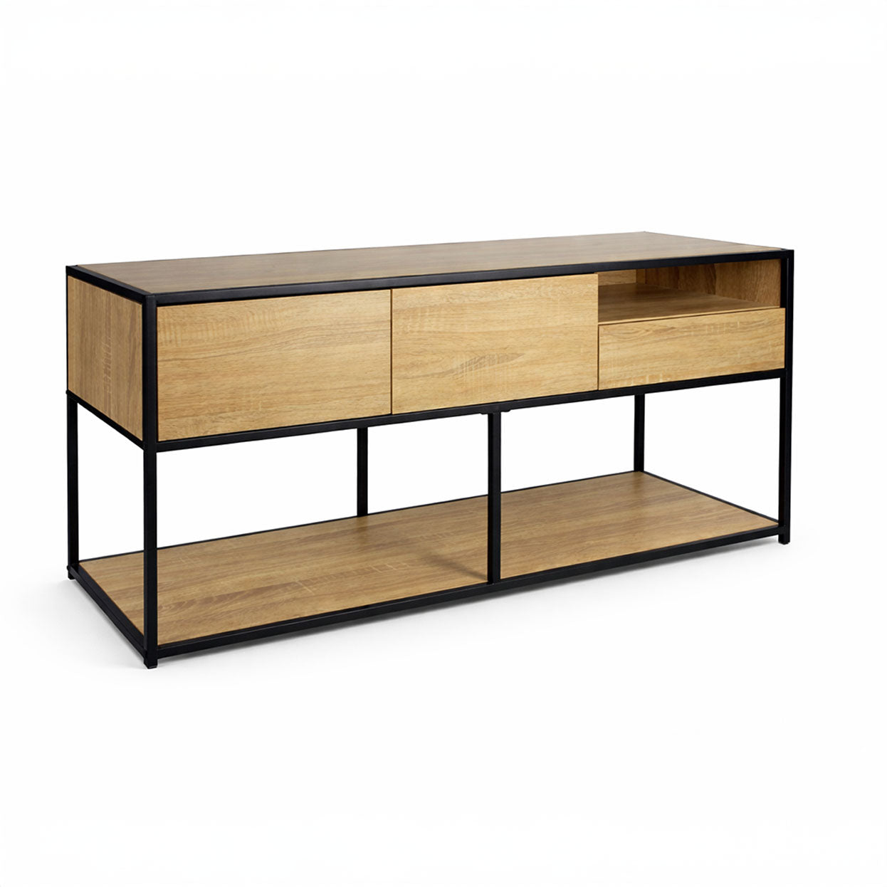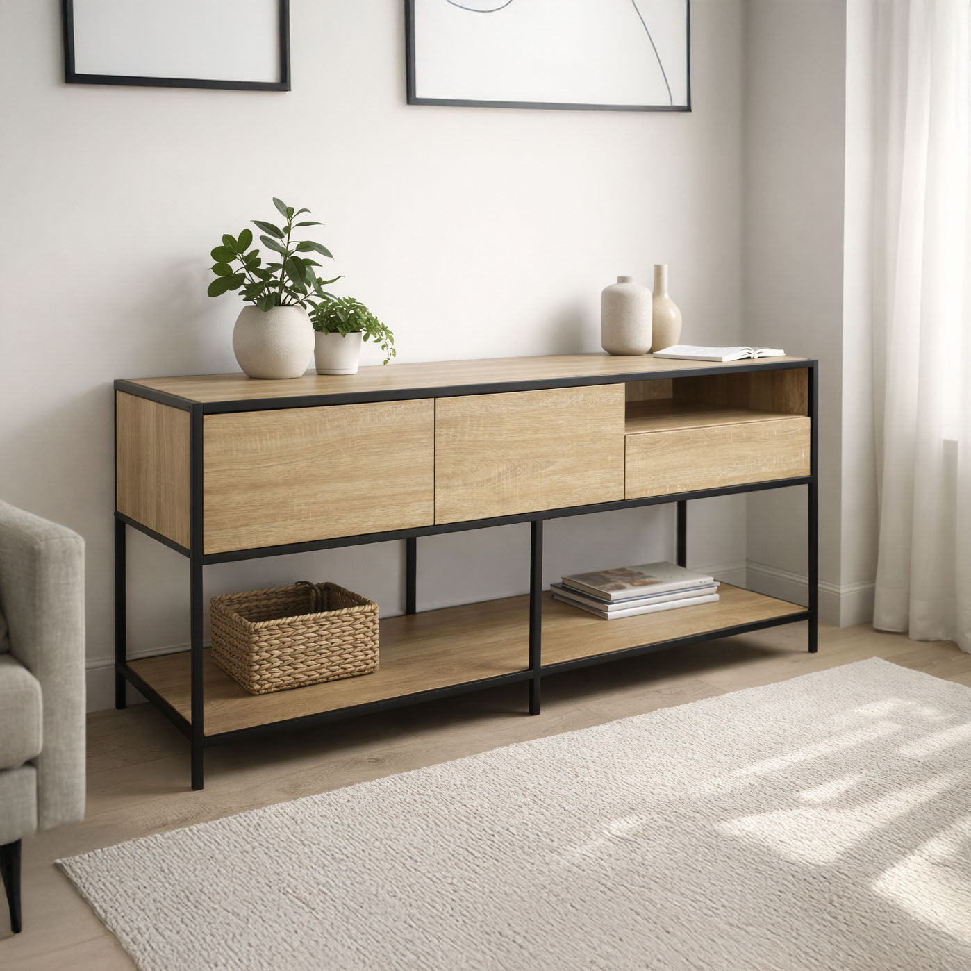 Enhance your living space with this light wood cabinet featuring a sleek black metal frame. Designed with a contemporary industrial aesthetic, it blends effortlessly into modern interiors such as living rooms, dining areas, or entryways.
