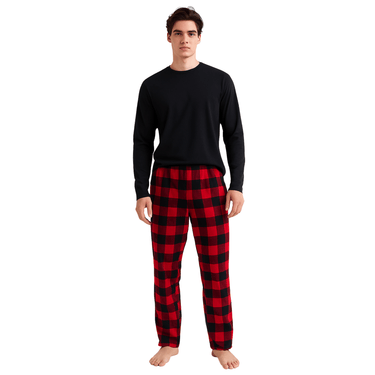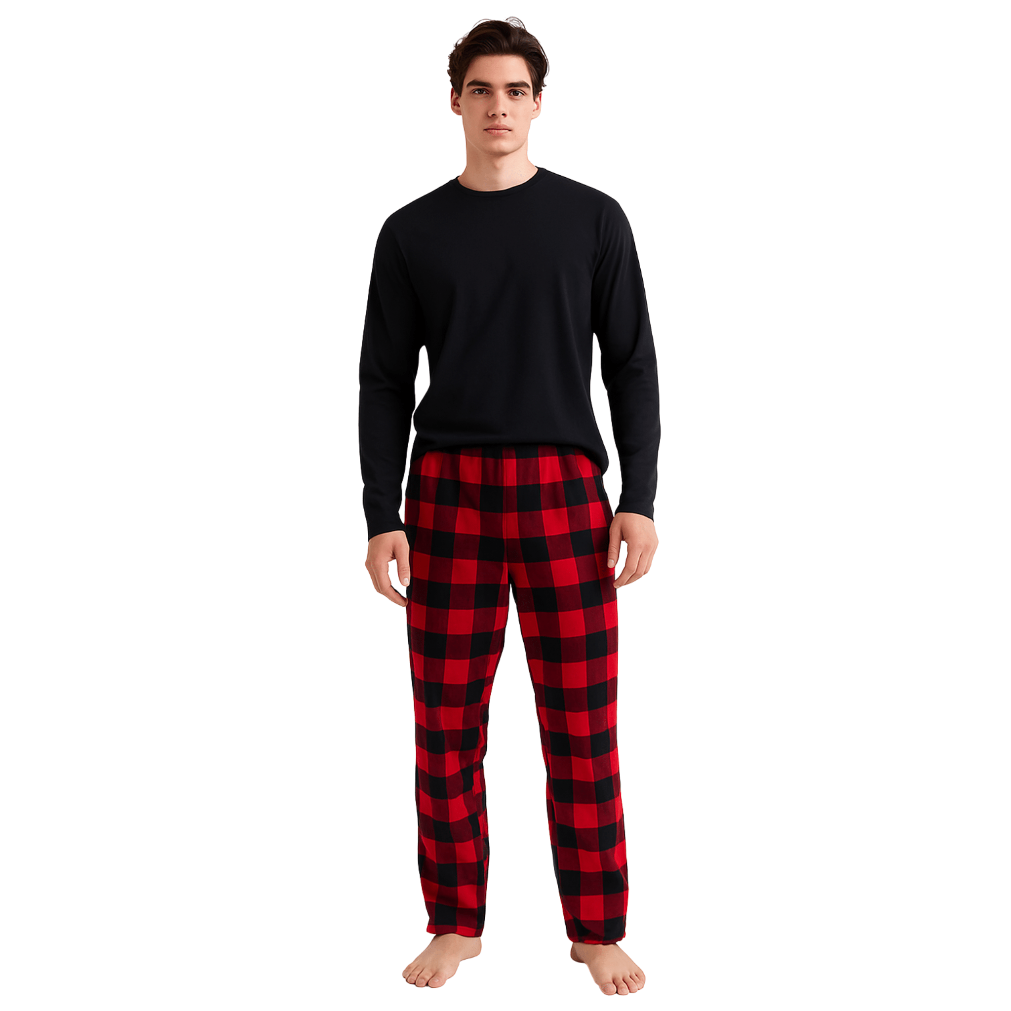 Men’s Cozy Lounge Set – Black Top & Red Buffalo Plaid Pants