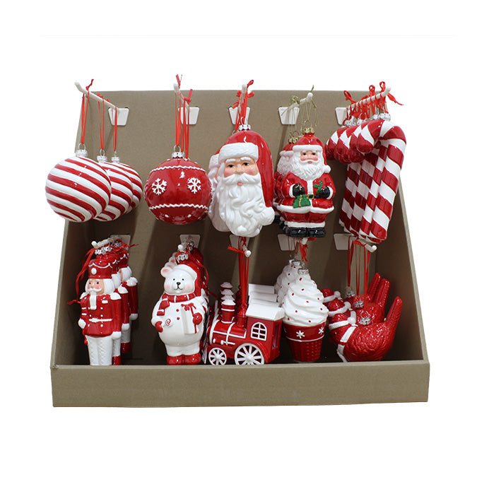 Home Assorted Character Ornaments – 42 Pieces in Peggable PDQ (Red & White, 9–15cm Height)