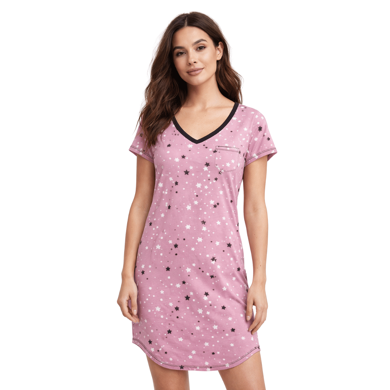 Designed for comfort and ease, this star print nightshirt is perfect for restful nights and relaxed mornings. Made from a soft, lightweight fabric, it features a relaxed fit that feels gentle against the skin. The contrast V-neckline and chest pocket add a feminine, modern touch, while the curved hem ensures comfort and freedom of movement. An effortless essential for sleeping or lounging at home.