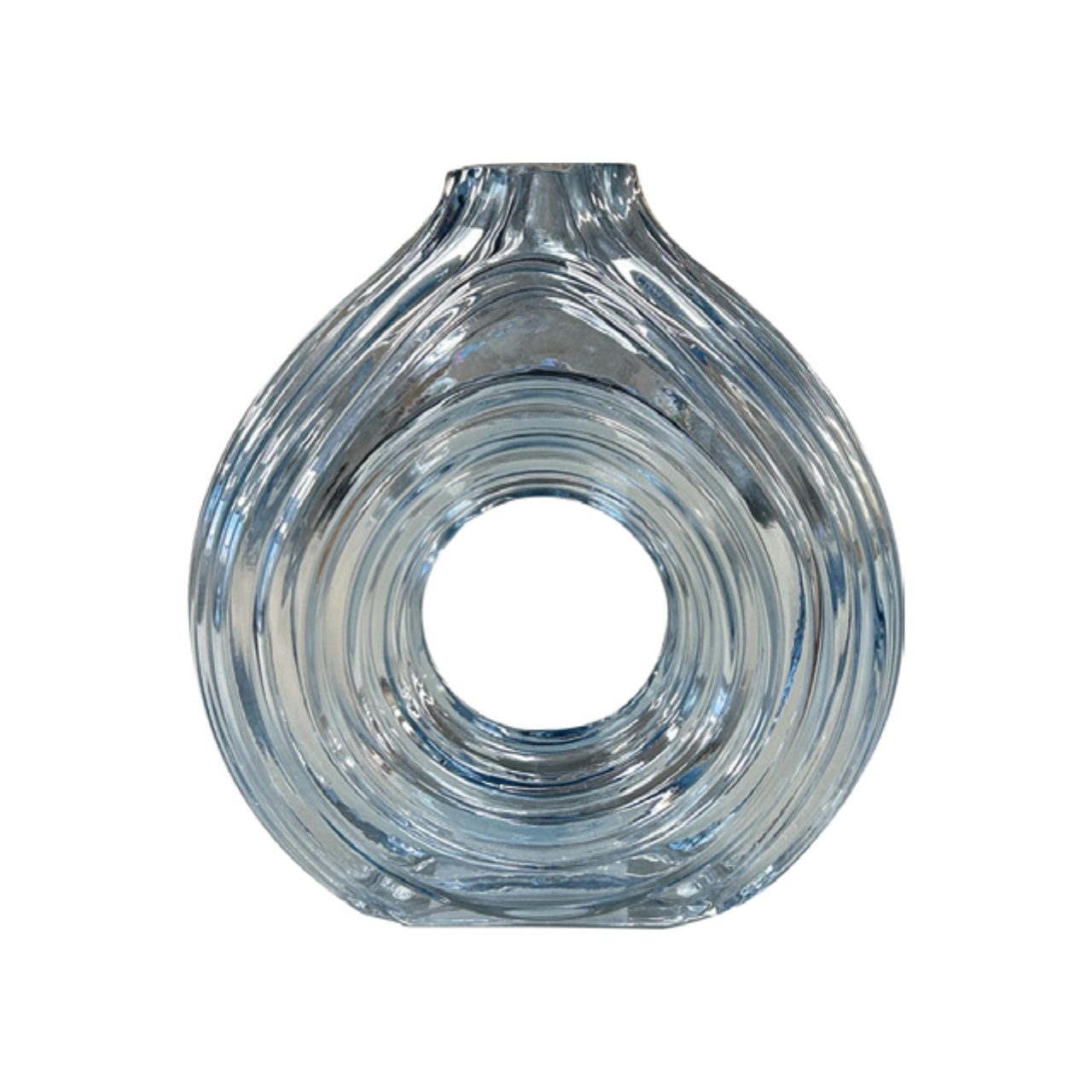 Modern and sculptural, this textured glass decorative vase features a striking central opening and flowing lines that beautifully catch the light.