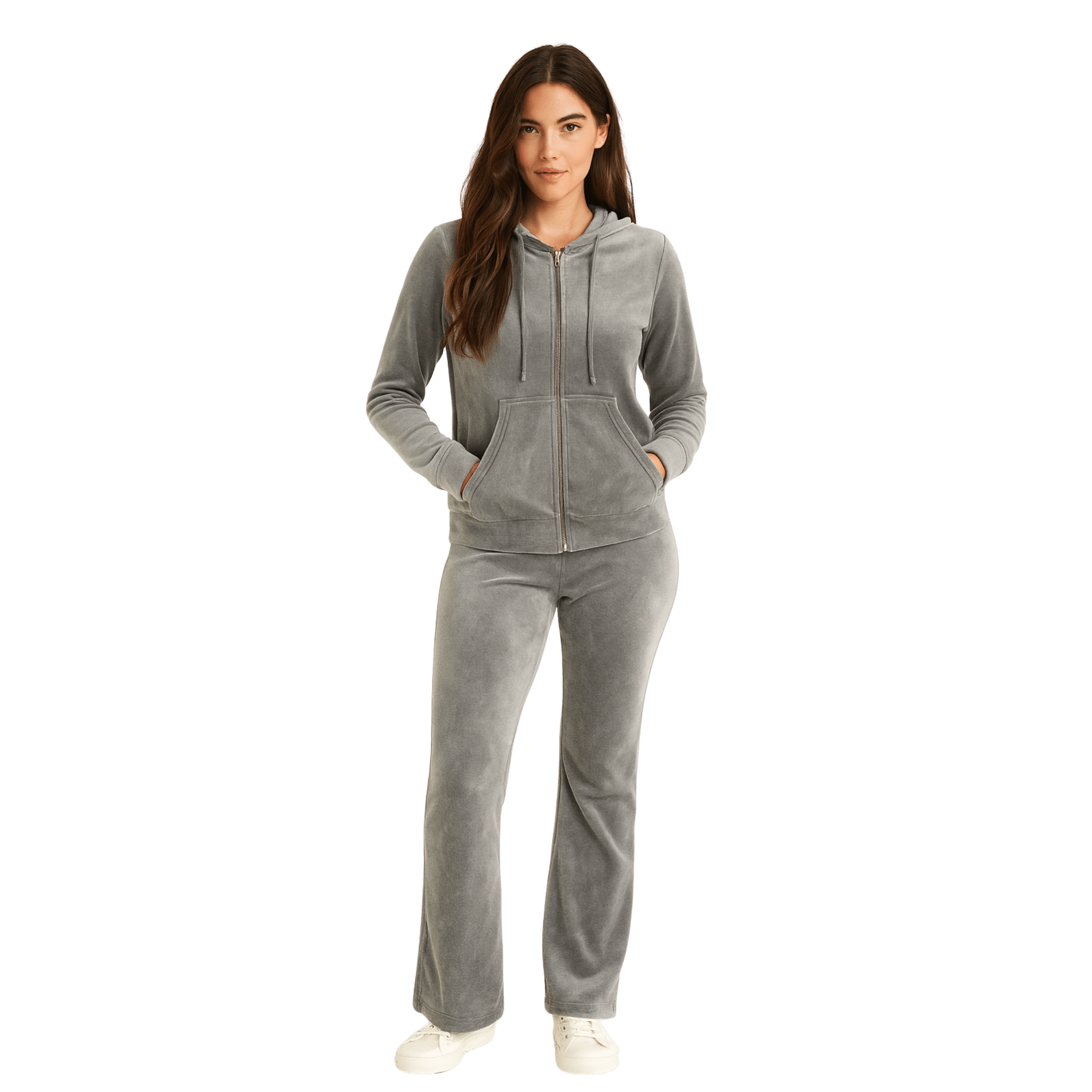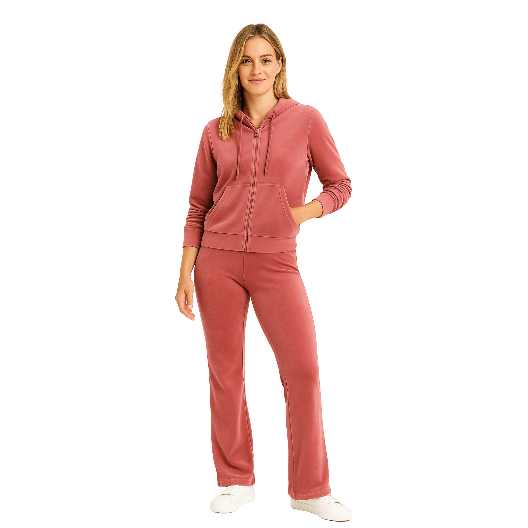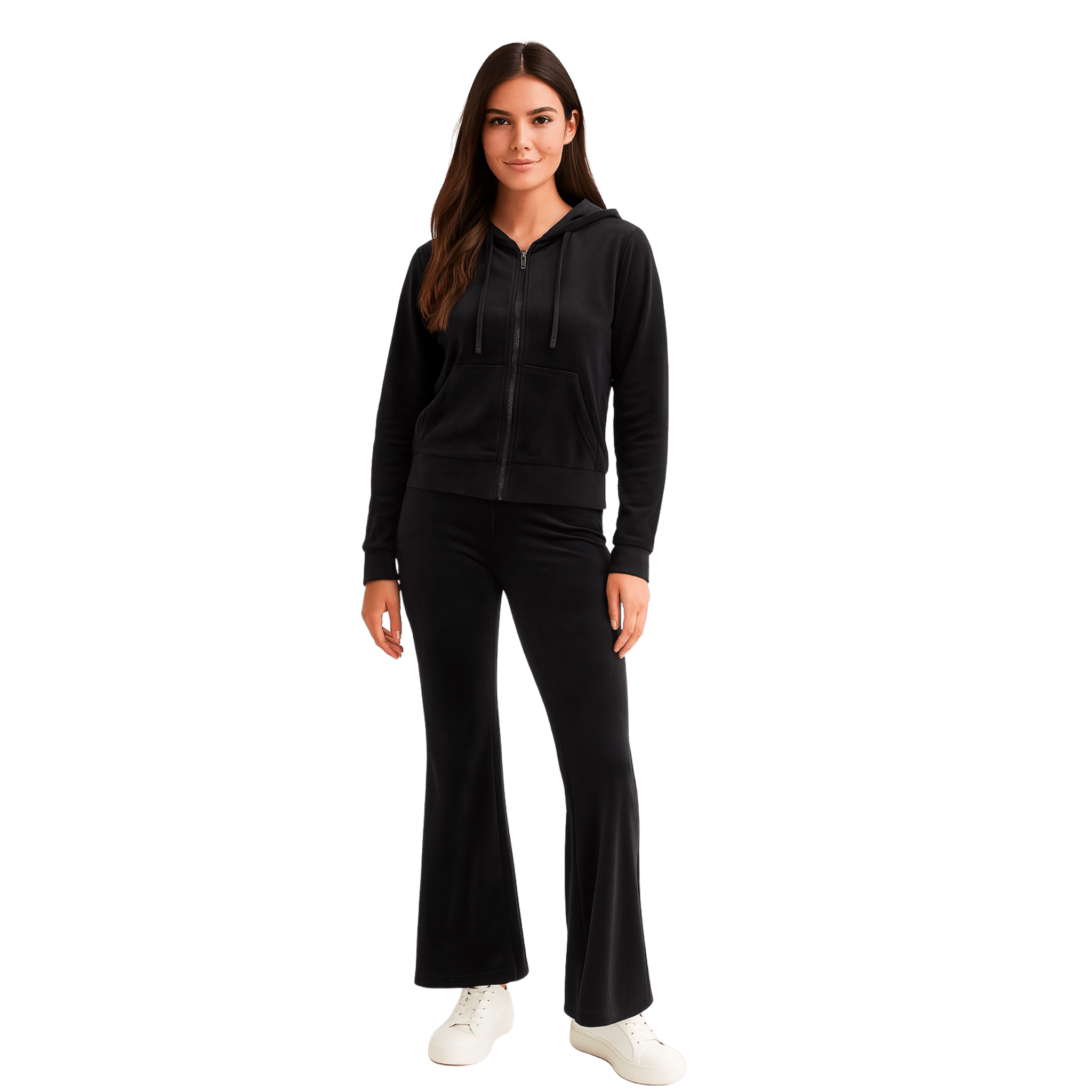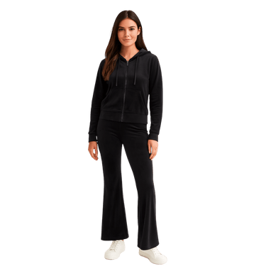 Rediscover everyday comfort with this velour lounge set, designed to bring softness and modern ease to your wardrobe. The zip-up hoodie features a relaxed silhouette with a drawstring hood and front pockets, making it the perfect layer for cozy days or casual outings. Paired with flared lounge pants that elongate the leg while offering effortless stretch, this set blends style and comfort in every detail.