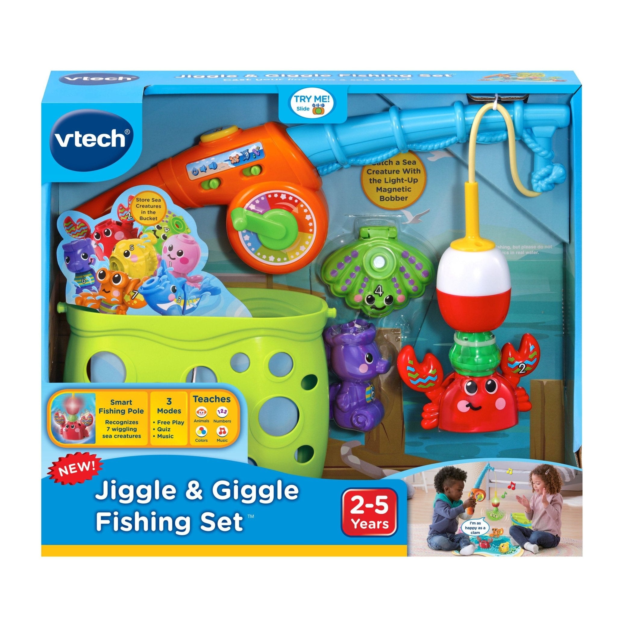 Cast your line into a sea of play and learning with the Jiggle & Giggle Fishing Set™! Catch a sea creature on the magnetic bobber and watch it wiggle. Seven sea creatures wait on the pretend pond playmat, ready to jump on your line. Will it be a blue marlin, a yellow pufferfish or something else? The smart bobber recognizes each sea creature you catch, triggering the creature to respond with its unique personality in songs and phrases. As kids play, the interactive fishing pole teaches about animals, colors and numbers with three play modes, 10 songs and five melodies. The light-up bobber changes its color to match the color of the sea creature to reinforce color learning. Lining up the bobber with each magnetic sea creature helps kids develop hand/eye coordination. Their reward is a friendly, wiggly creature on the line! Place your catch in the storage bucket, and when playtime is done, tuck the pond playmat inside with all seven sea creatures. Intended for ages 2–5 years. Requires 2 AA batteries. Batteries included for demo purposes only. New batteries recommended for regular use.
