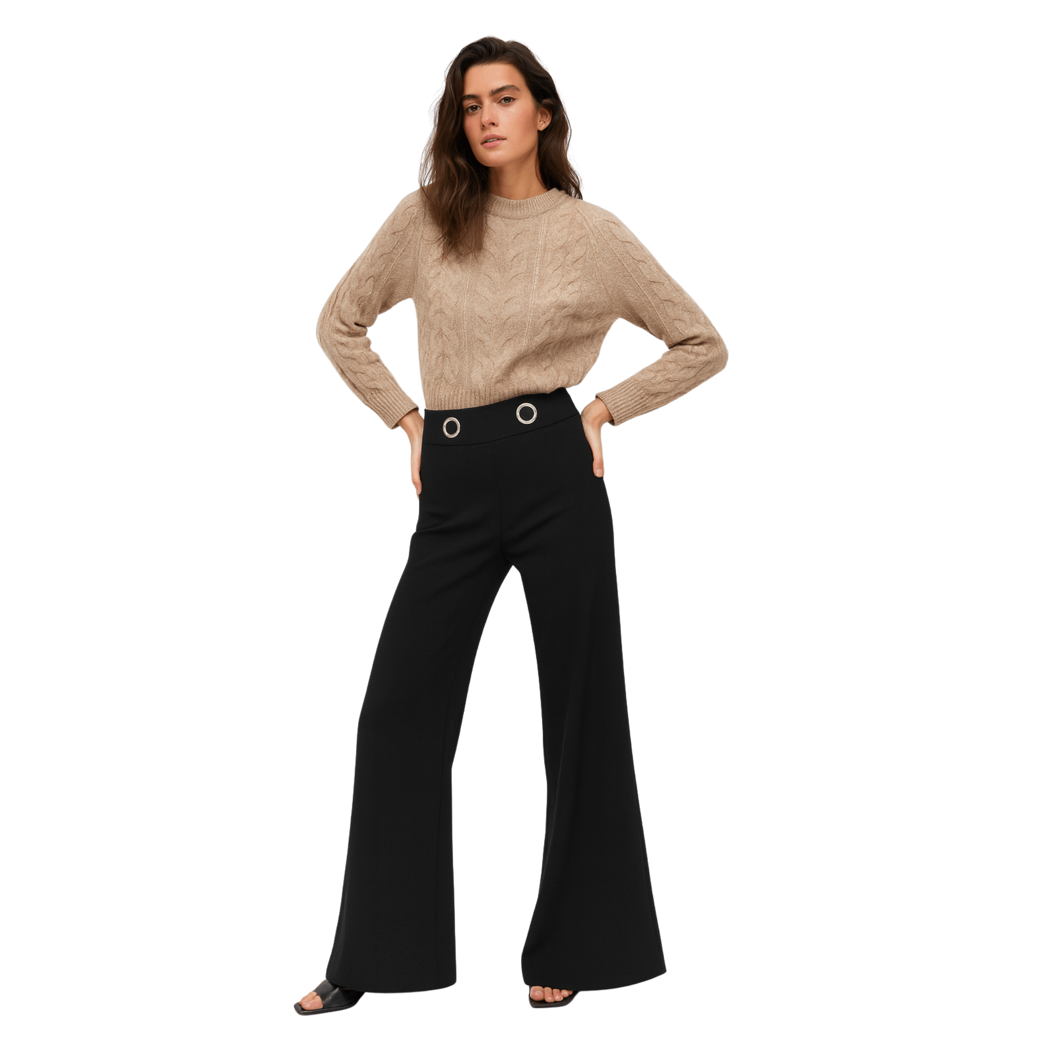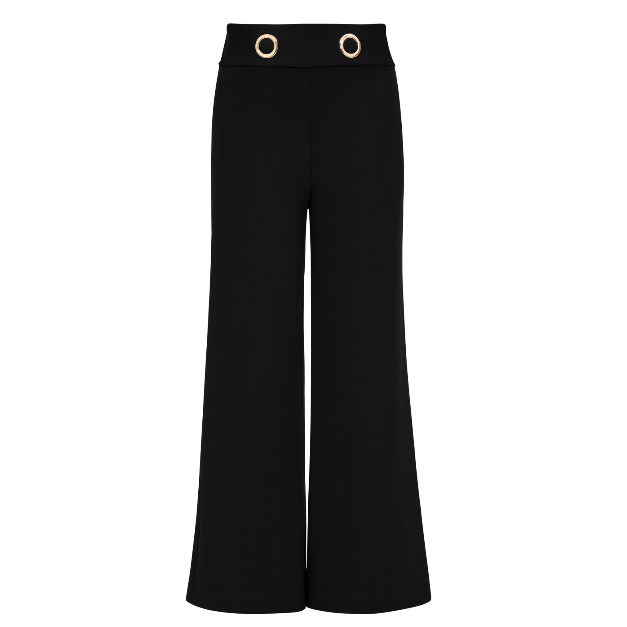 Elegant with a touch of modern edge, these wide-leg pants redefine effortless sophistication. The high waistband is accented with bold metallic grommets, adding a contemporary statement to a clean, flowing silhouette. Crafted from a smooth, structured fabric, these pants drape beautifully and offer refined movement—perfect for elevating everyday looks or polishing your evening style.