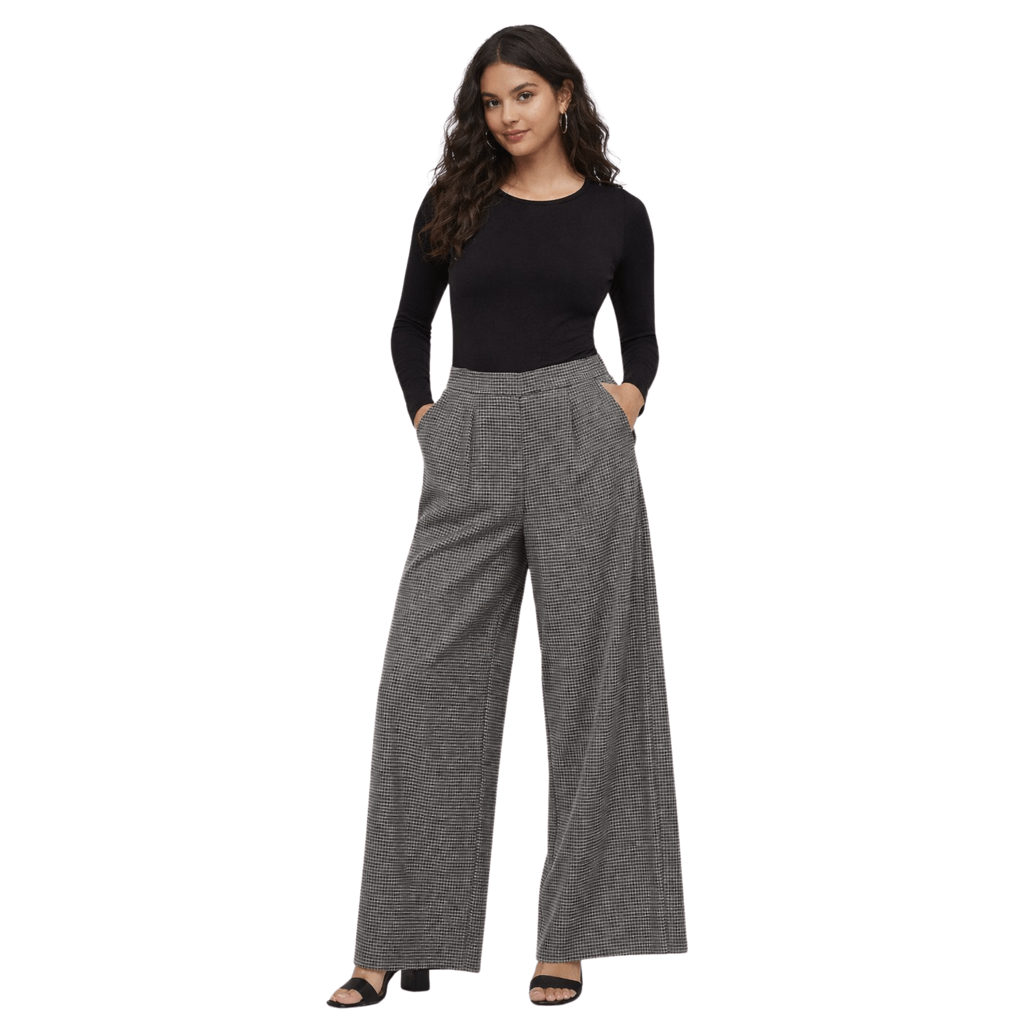 These wide-leg tailored trousers bring effortless sophistication to everyday dressing. Designed with a high-rise waist and soft front pleats, they create a flattering, elongated silhouette while offering ease of movement. The subtle check pattern adds a refined touch, making them easy to dress up with a blazer or down with a simple knit for a polished yet relaxed look.